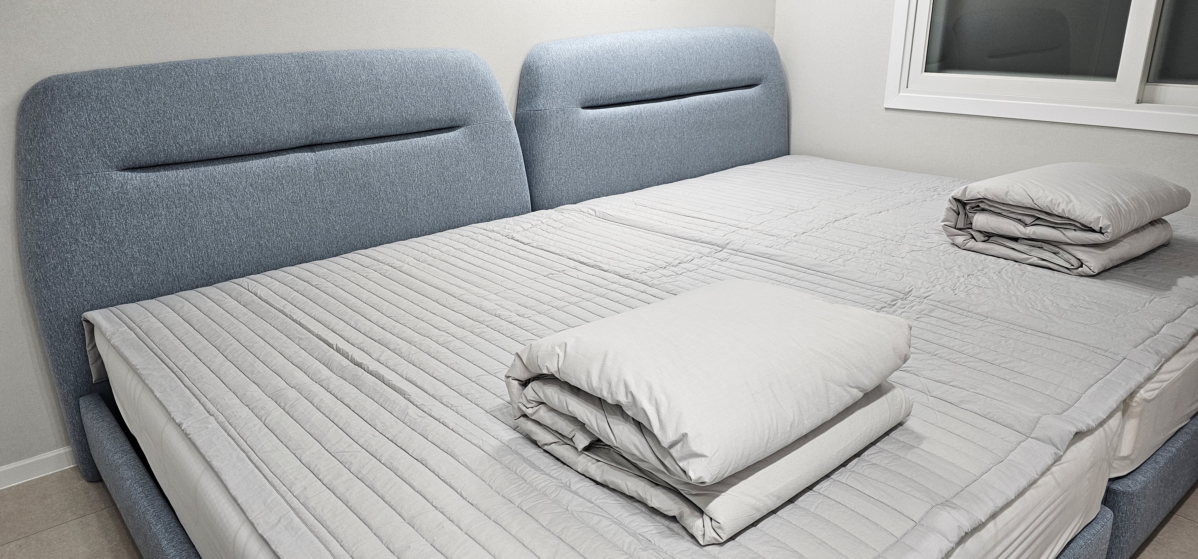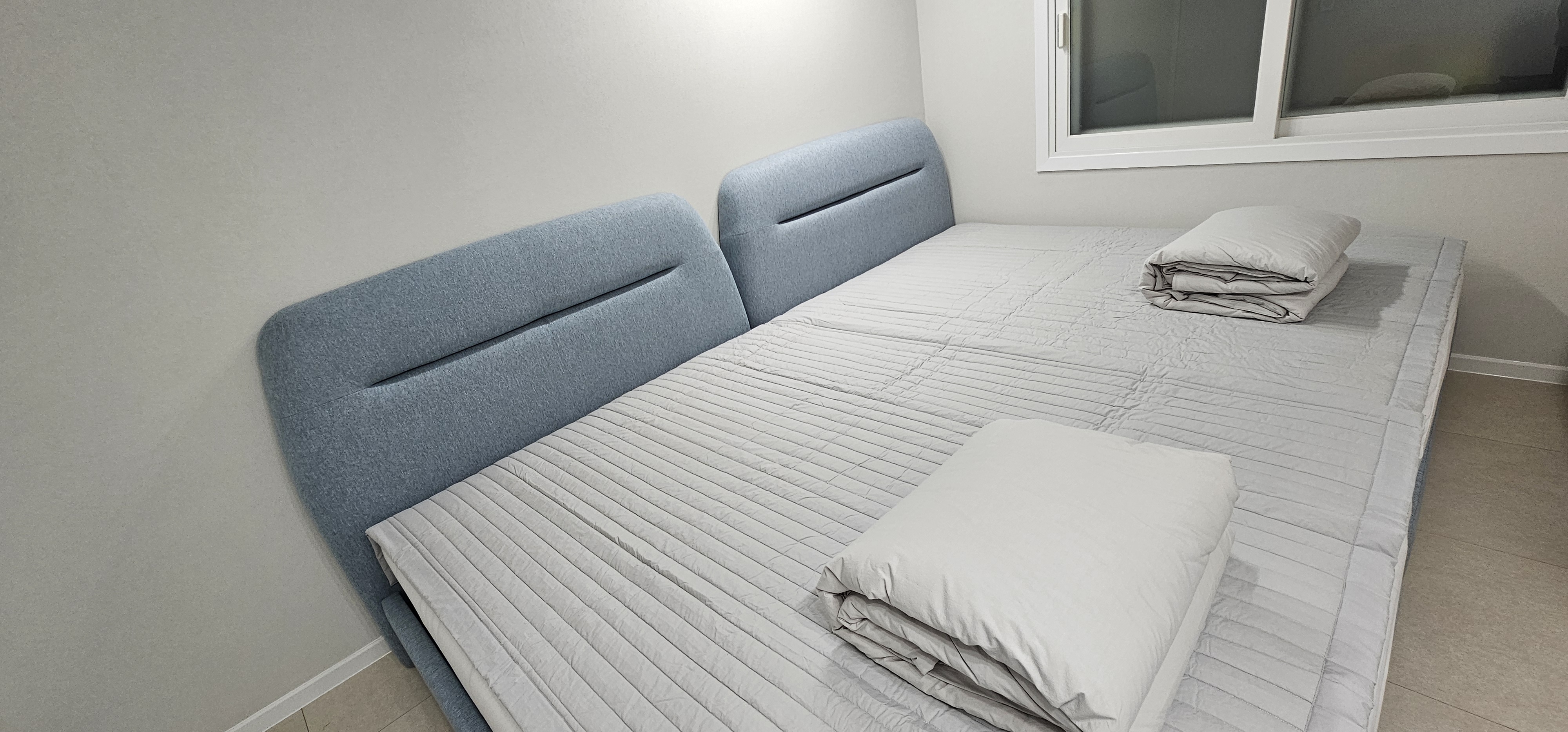 아이들 침대 사이즈를 더블로 하고싶었지만 프레임 선택의 폭이 많지않아 퀸 두개로 선택하였고 집에 고양이가 있다보니 프레임은 가죽재질x 개인적 취향으로 우드x로 최종적으로는 lene를 고르게 되었습니다. 마침 행사를 하는 부분에 있어서도 점장님께서 세심하게 챙겨주셨고, 프레임 사이 간격으로 인해 매트가 딱 붙지 않는 부분에 대해서도 너무 친절하게 같이 고민해주셨어요 (살짝 뜨지만 매트를 중앙으로 미는 방식으로 매트를 붙였습니다). 매트리스가 두껍고 견고하여 조금 밀어도 문제없더라구요!! 퀸 두개가 붙어있는데 아이들이 좋아하는것은 말해 뭣하겠어요 ㅎㅎ 안방은 비우고 가끔씩 네식구 모여 여기서 자도 조금도 좁지않은 광활한 크기. 정말 놀라운건 제가 잠자리를 옮기면 다름날 허리가 많이 불편했는데 여기서 처음으로 잤던날은 어디 한군데 불편한곳 없이 아주아주 개운하게 일어났다는거예요! 이래서 침대는 매트리스에 신경써야 하는구나 하고 느꼈답니다. 남자아이들이라 프레임도 푸른 계열 컬러로 구매했는데 색도 은은하니 너무 예뻐서 구매 후 한달이 조금 넘은 지금 아주아주아주 만족하며 사용중입니다 :) 설치기사님들도 매우 친절하시고 설명도 잘 해주셨어요. 구매부터 설치 후 사은품까지 잘 챙겨주셔서 너무 감사해요!