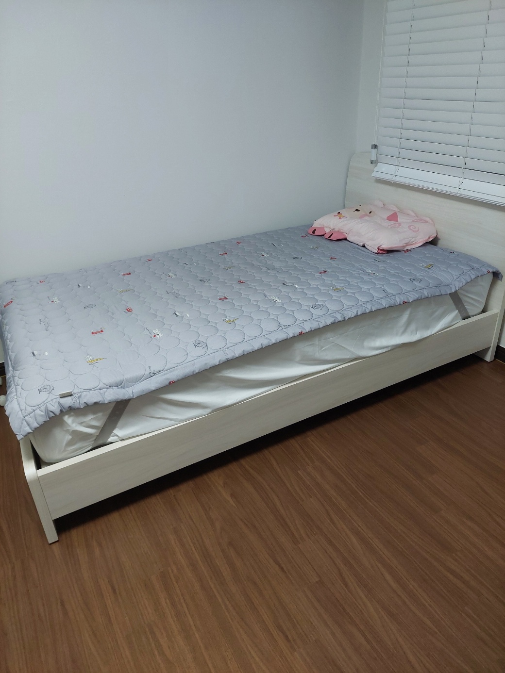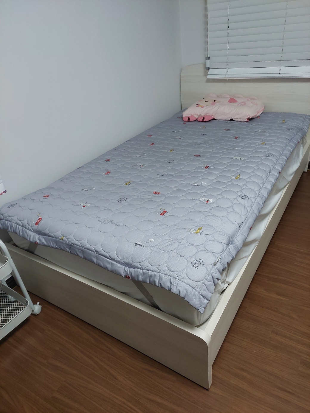 침대프레임은 무난한 화이트계열 색상에 깔끔한 헤드보드 디자인으로 되어 있어서 여자아이 취향에 딱 맞는 듯 하구요. 각 모서리마다 부드럽게 곡선처리 마감되어 있어서 고급져 보이고 지나다니다 발 다칠 염려가 적을 듯합니다.
