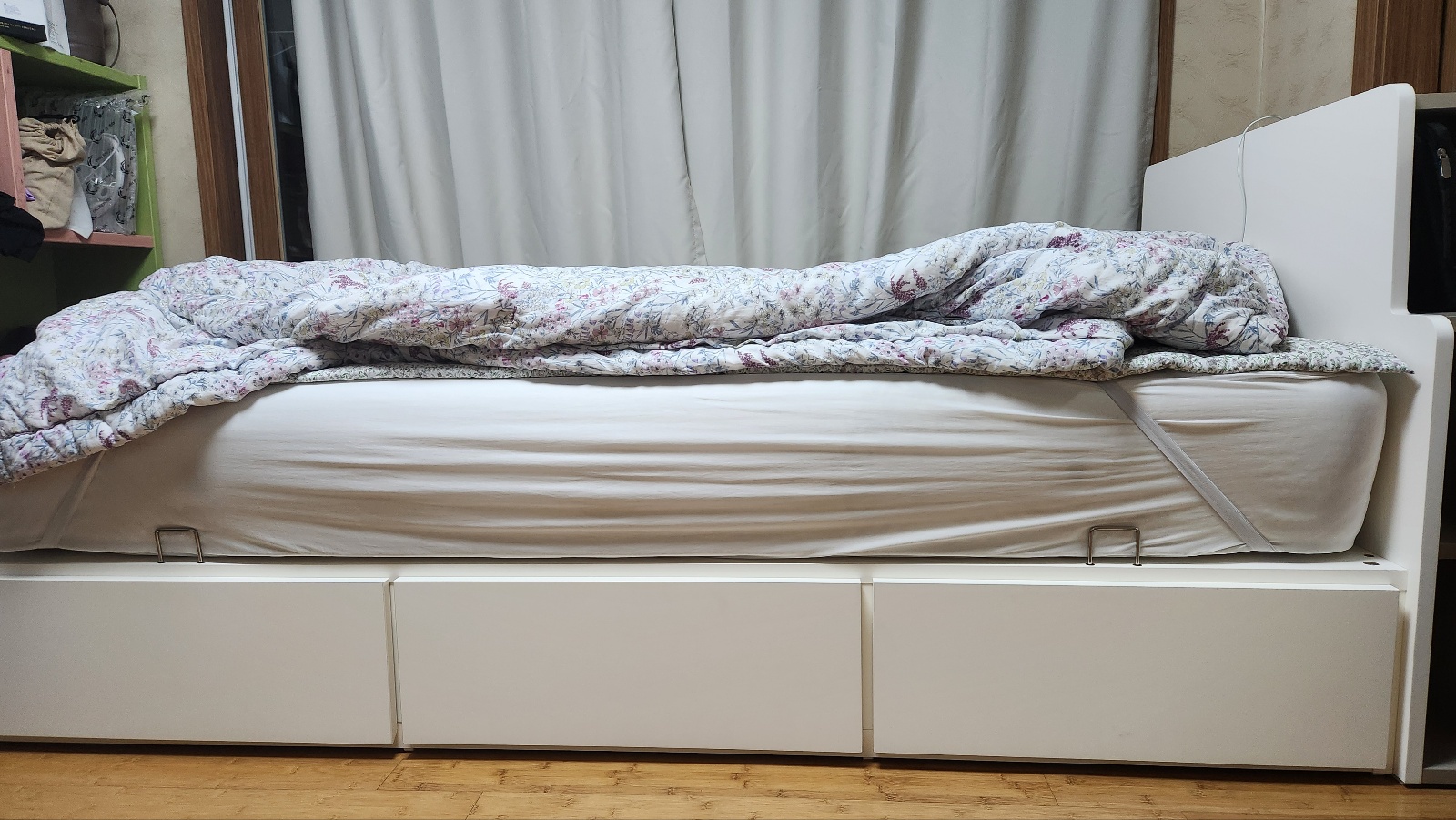 침대구매한지 6개월 다 됐어요.. 너무 잘 쓰고 있어요 침대 아래 수납도 넉넉해서 두꺼운 후드 티, 겨울옷 보관하기도 좋아요... 휴대전화충전 케이블이 짧아서 그건 좀 불편했지만.. 긴 콘센트 구입해서 연결해서 사용하고 있어요 . 매트리스도 튼튼해서 건강한 딸의 무게도 잘 지탱해주고 있어요 침대헤드옆에 책을 두거나 간단한 물건정리 할 수있는 공간도 있어서 편하게 잘 사용 하고 있어요 침대 곳곳에 수납할 수 있는 공간이 많아서 특히 학생들이 쓰기 좋은 침대에요. 쌓이는 먼지는 가끔 청소해 주고 있어요 침대고정핀은 완전히 고정되는건 아니지만 큰 도움이 되고있어요 여러모로 쓰임이 좋은 침대에요
