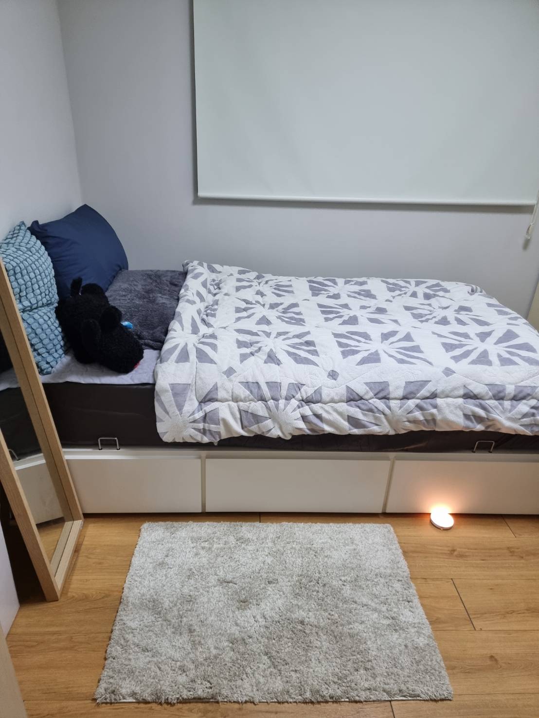 침실이 작아서 헤드까지 들어가기는 어려워 보여 헤드를 빼고 주문했습니다. 기사님들이 방문하셔서 빠르게 조립해 주시고 가셨습니다. 침대를 벽면에 붙이는 게 좋지 않다고 해서 사이를 띄워주었어요. 안 띄었으면 여러모로 불편했을 뻔...
