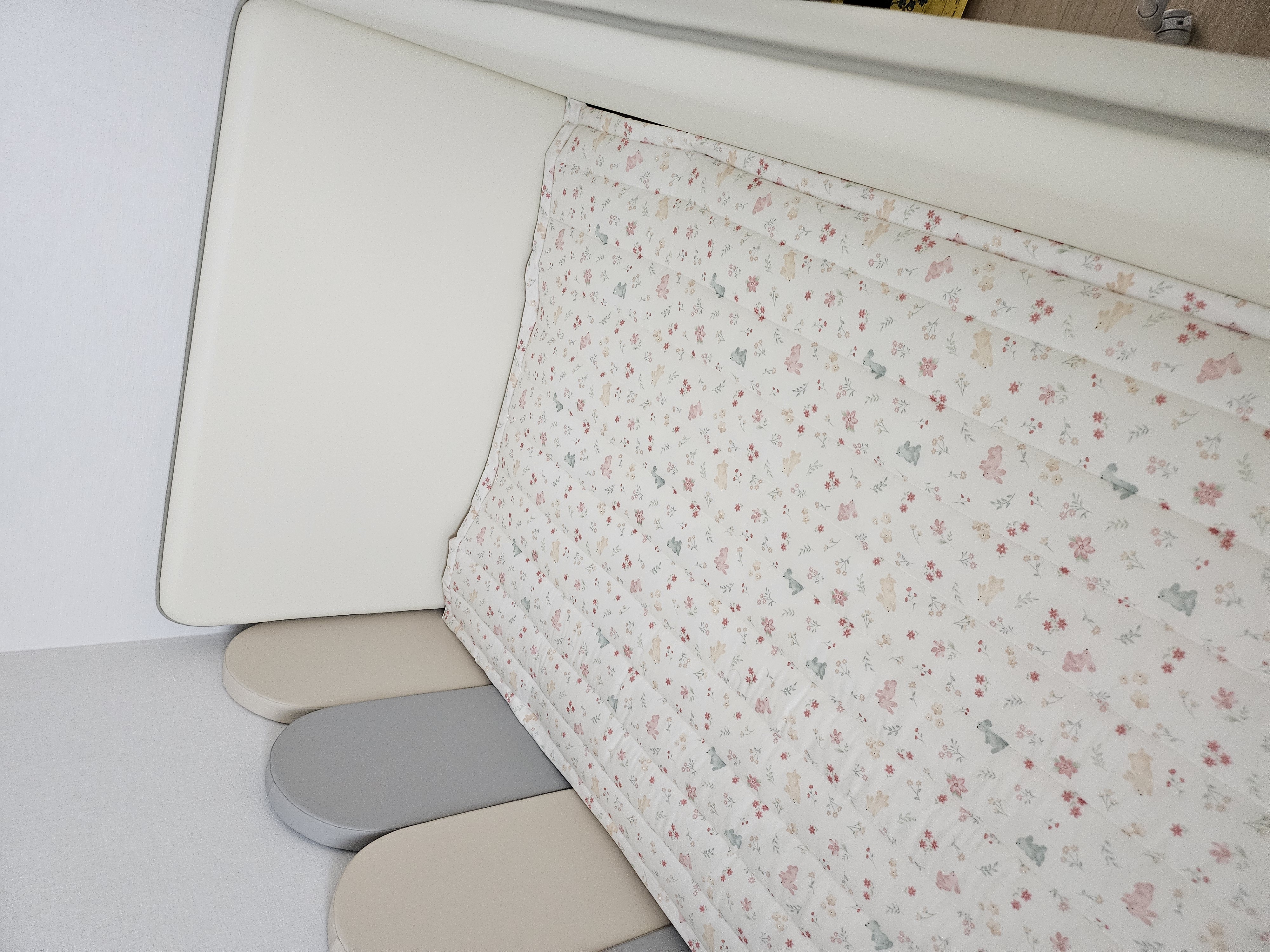 슈퍼싱글 사이즈는 아기와 성인한명이 눕기에 충분하네요. 아기가 새보금자리에서 편안히 잤으면 좋겠습니다:)