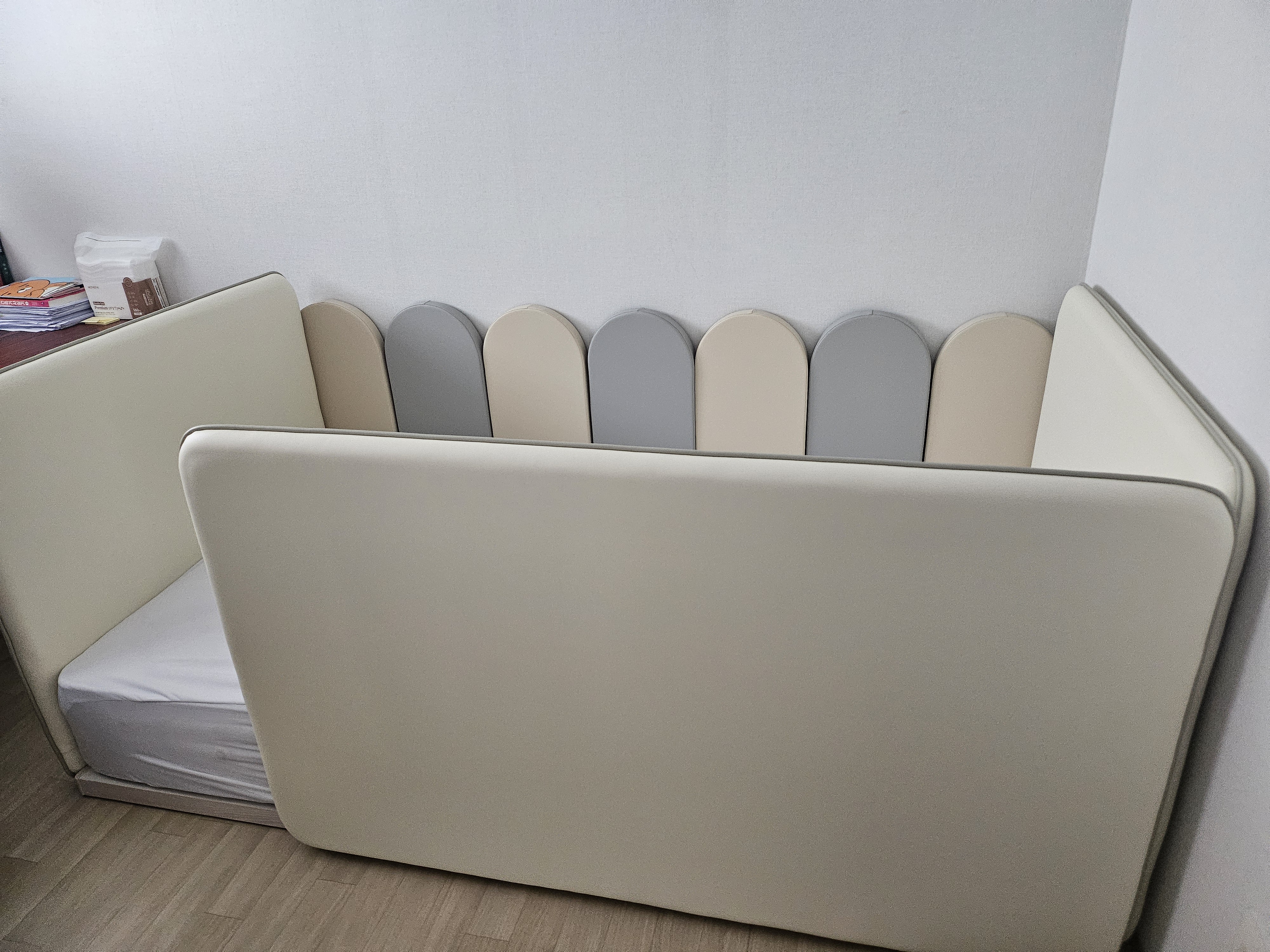 일단 환한 베이지 색상이 아기침대로 딱이라고 생각했고, 가죽 소재이다보니 패브릭보다 관리가 쉬울것 같아요. 가드 높이도 타브랜드에 비해 높습니다. 에이스 매트리스는 엄마들 사이에 아기 매트리스로 워낙 유명해서 믿을수 있었습니다. 실제로 누워보니 적당히 탄탄해서 아기침대로 딱인건 같습니다.