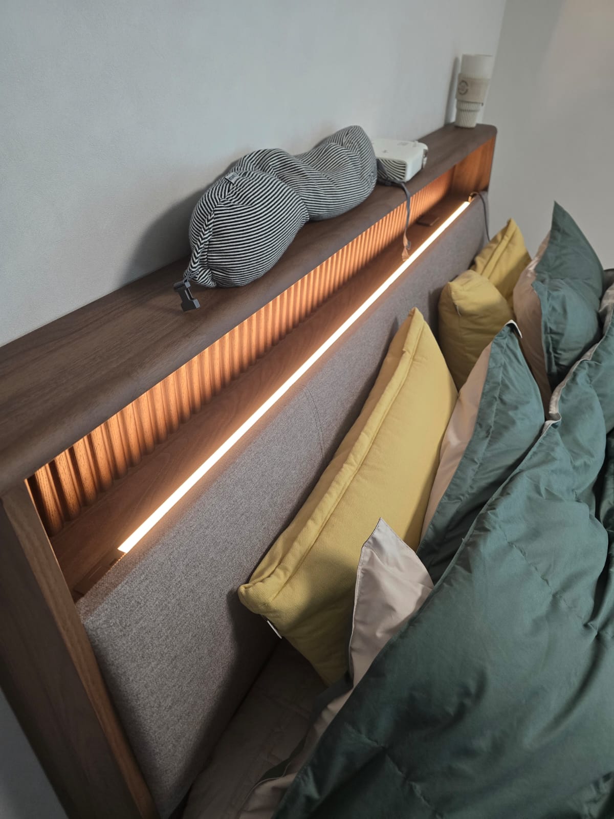 매트리스는 빠르게 결정했지만, 프레임은 조금 고민 끝에 꽤 비싼 제품으로 선택했어요. 집에 들여놓고 보니 고급스럽게 보이고 침실 분위기를 확 살려줘서 만족도가 높아요. 특히 프레임에 있는 무드등이 은은하게 분위기를 잡아주고, 옆에 달린 충전기가 고속 충전까지 지원해서 자기 전에 휴대폰 충전하기 너무 편리하고 좋더라고요!