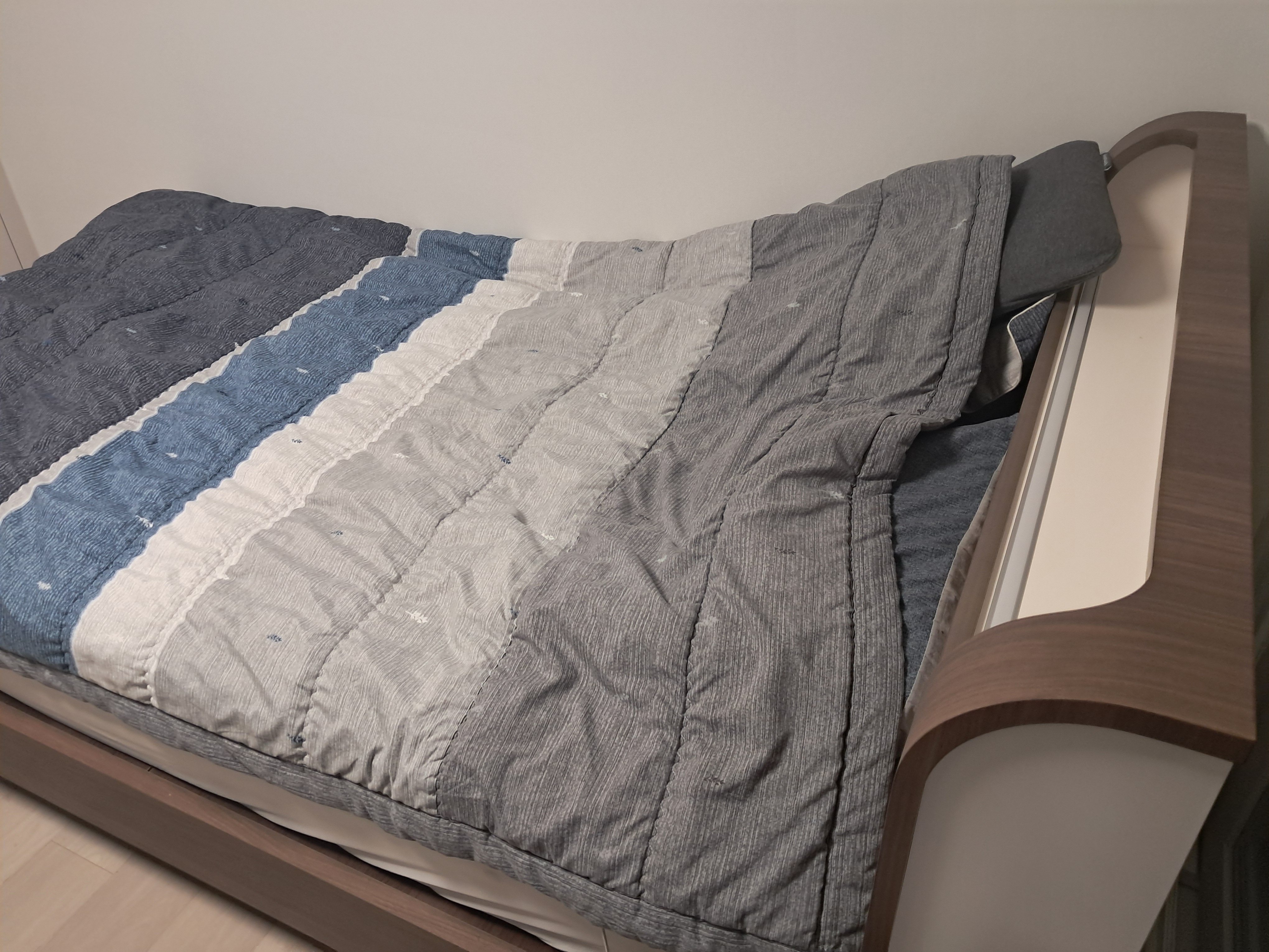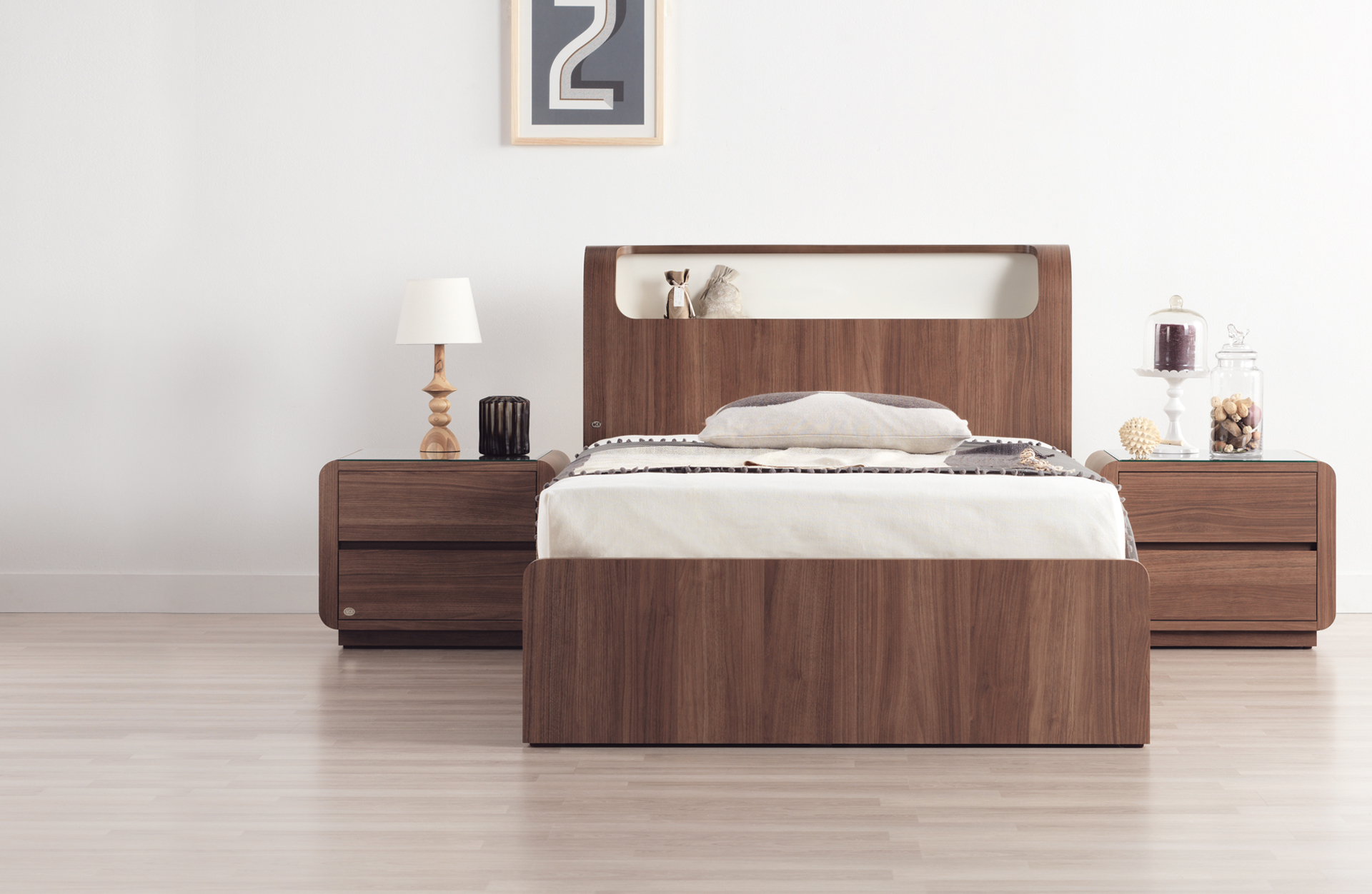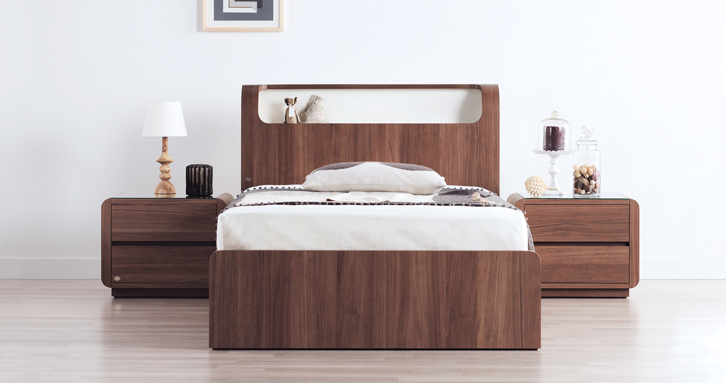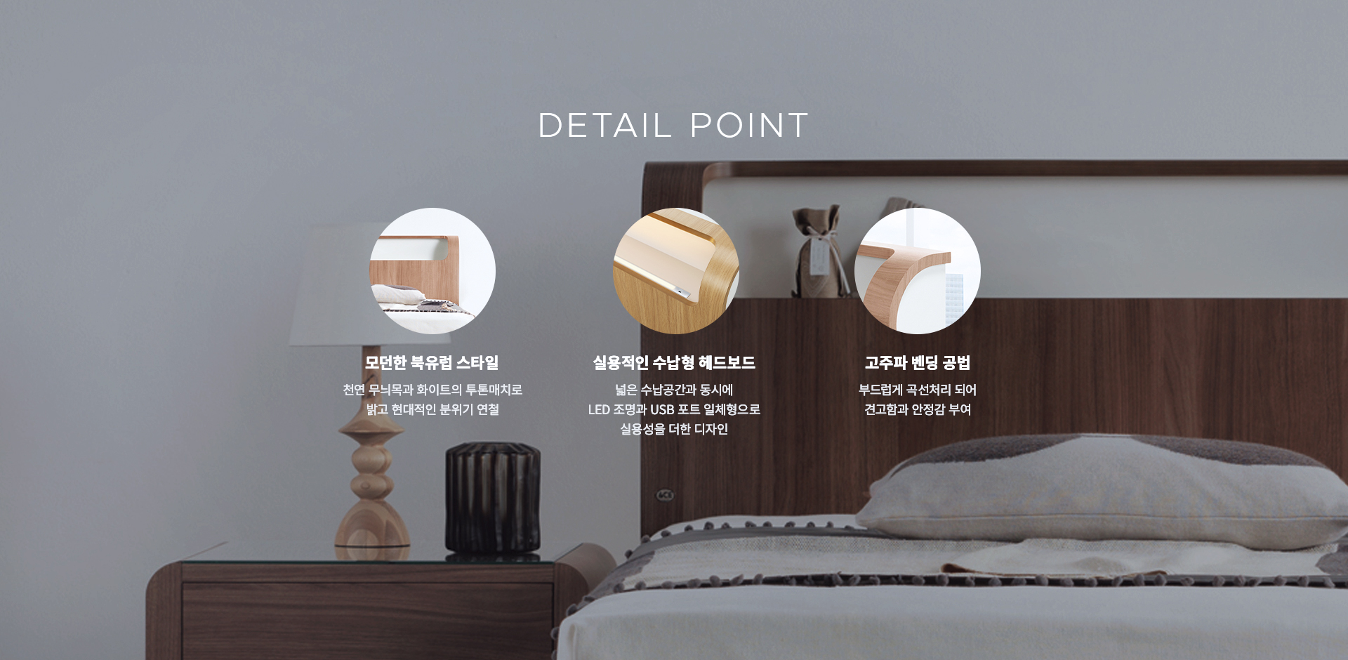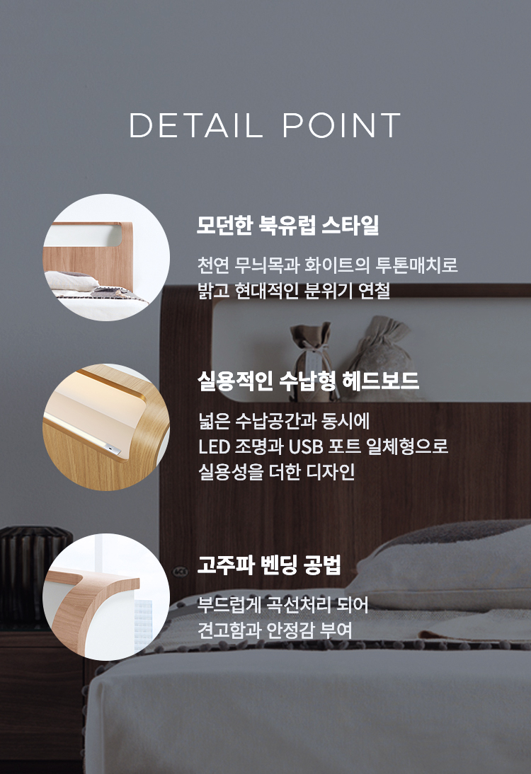 전면 판넬은 고주파 벤딩기술이 적용된 디자인으로 헤드와 프레임 하단에 수납이 가능하도록 넉넉한 공간을 두어 사용자의 편의성을 더했습니다. 네츄럴한 질감의 소재를 사용하였으며 색상은 고급스러운 월넛 무늬와 화이트를 투톤 메칭하여, 어떤 공간에도 잘 어울릴 수 있도록 하였습니다.
