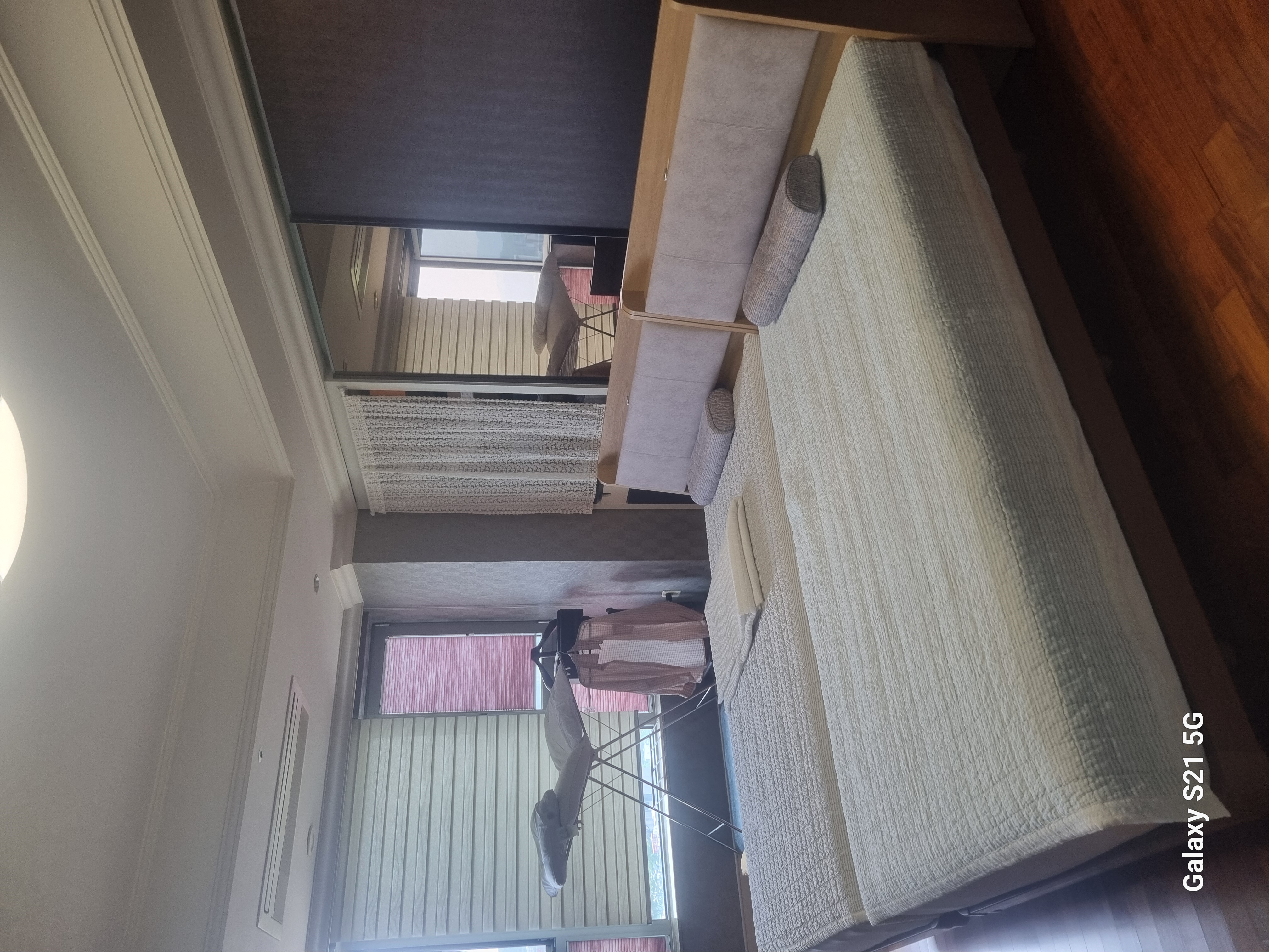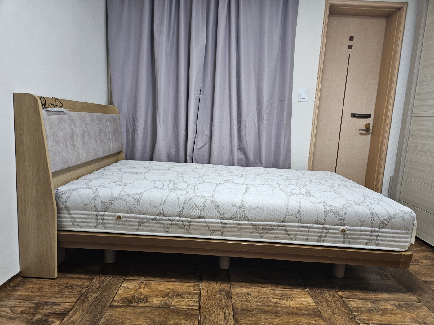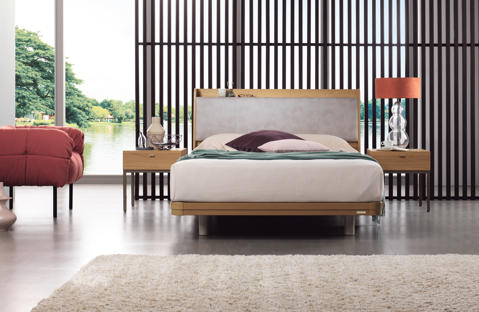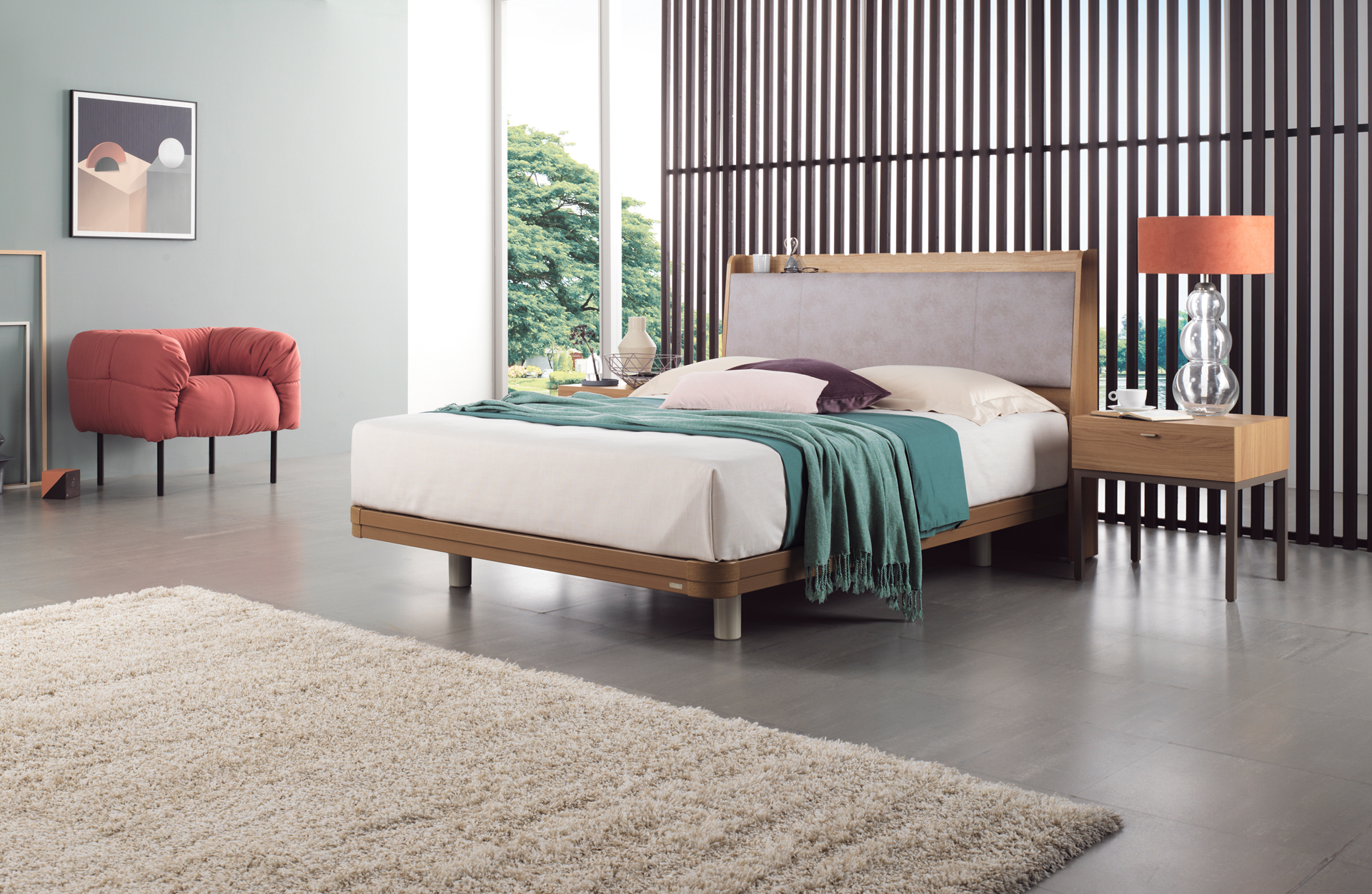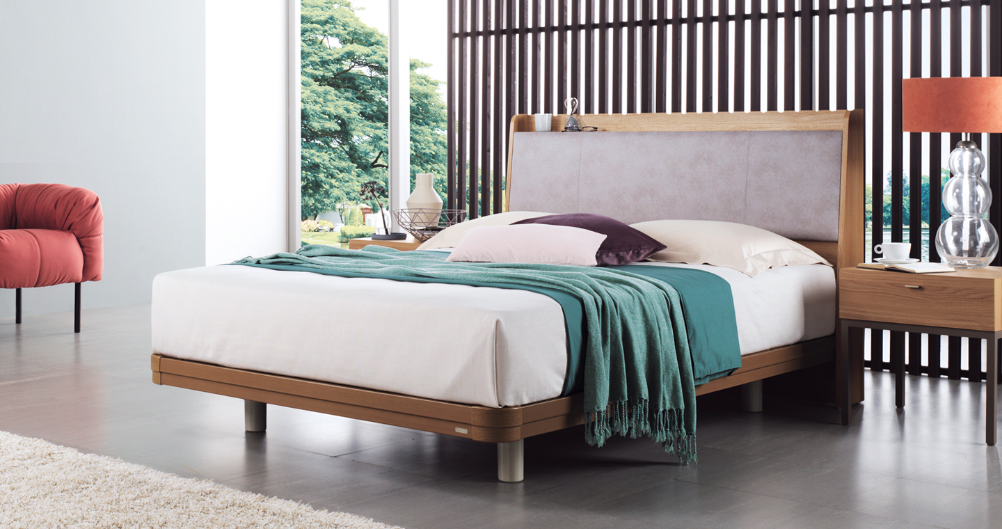우드컬러와 가죽질감의 헤드보드가 조화로운 침대