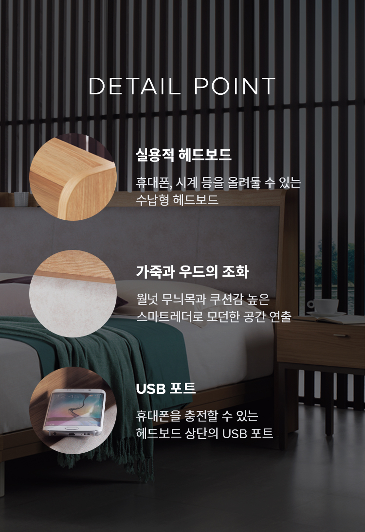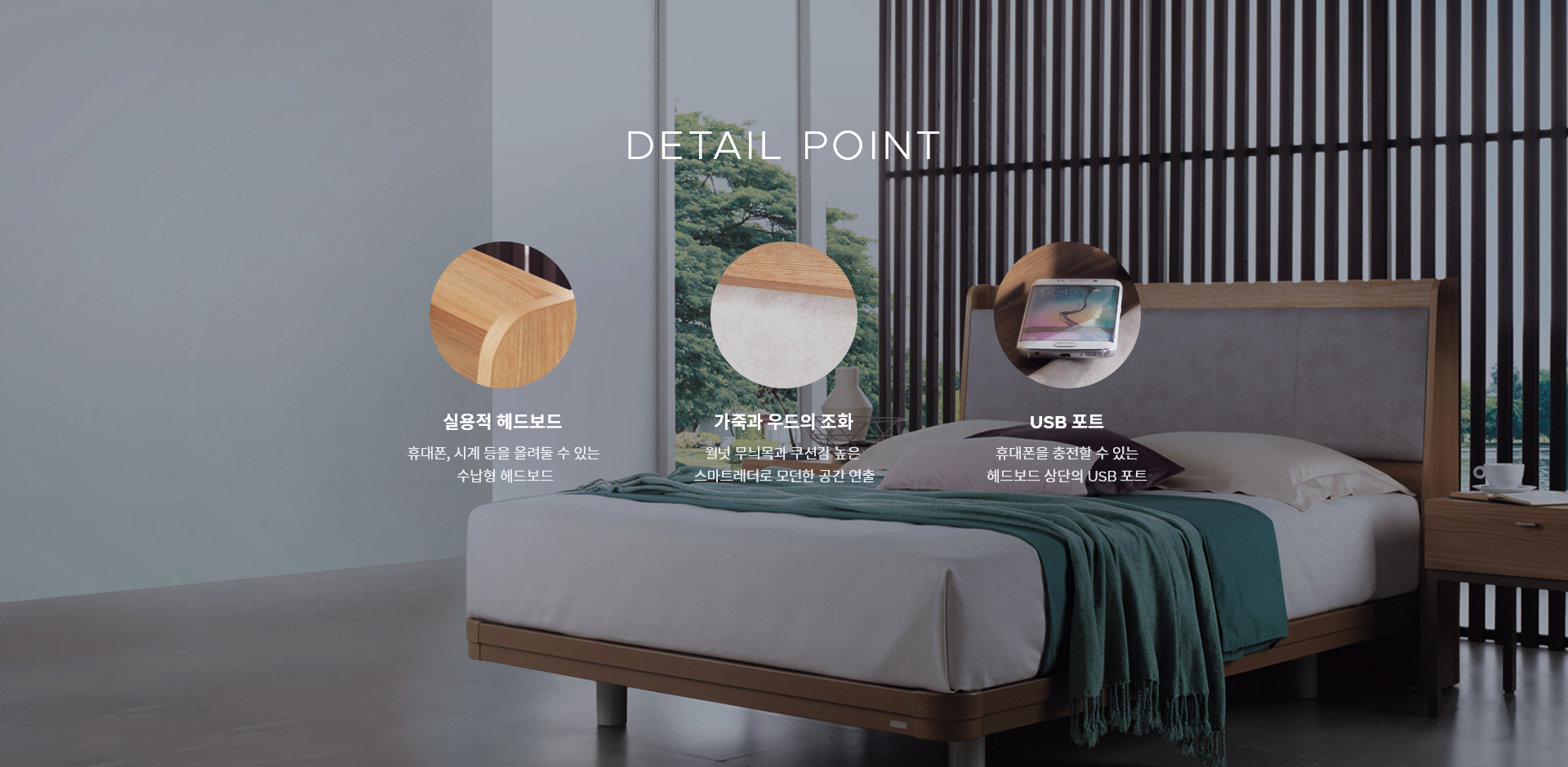 내추럴 오크 컬러 우드에 실용성을 더한 수납기능과 라이트그레이 스마트레더 쿠션의 적용으로 안락한 느낌을 동시에 연출 할 수 있습니다.