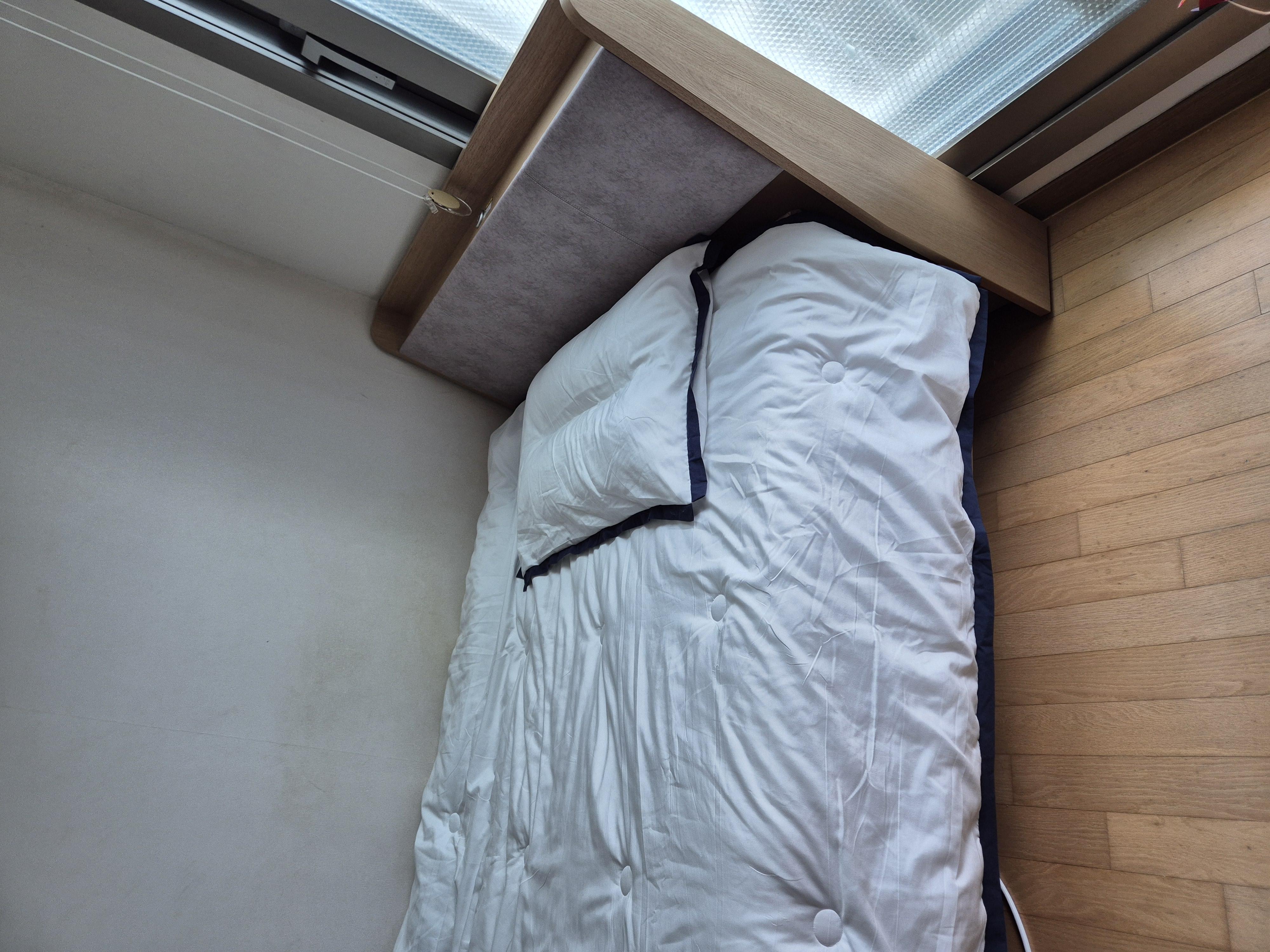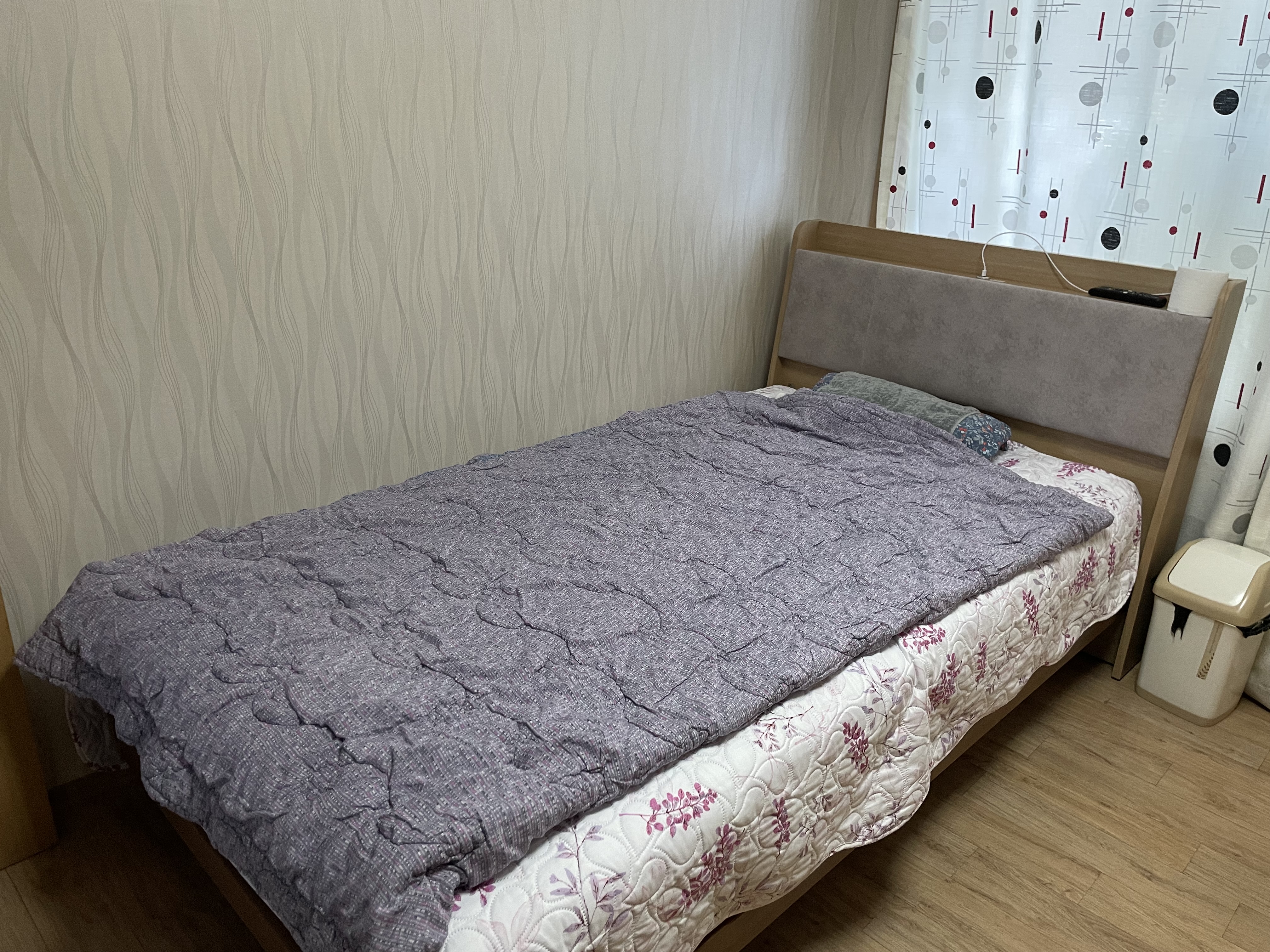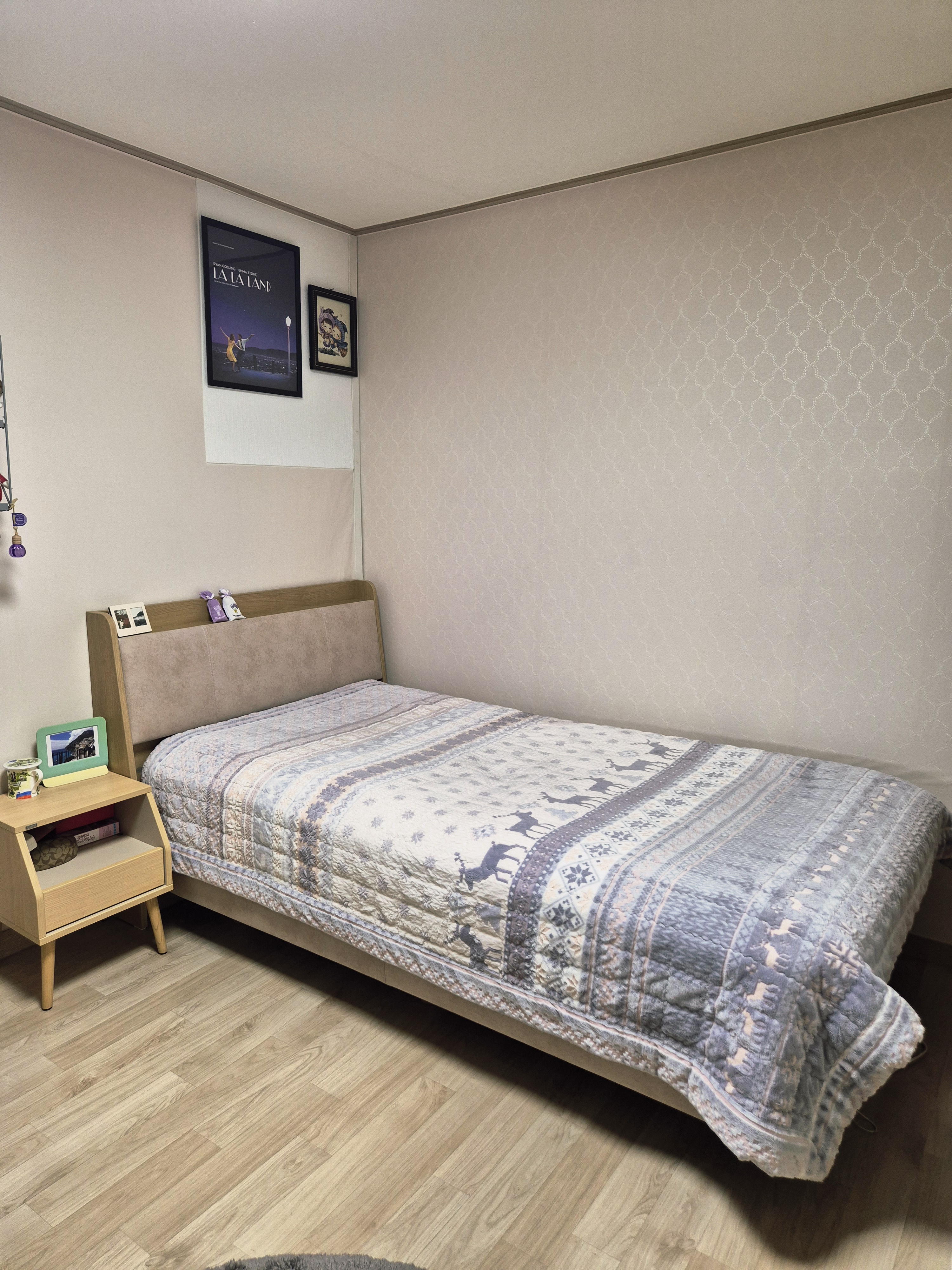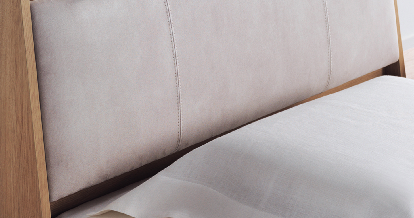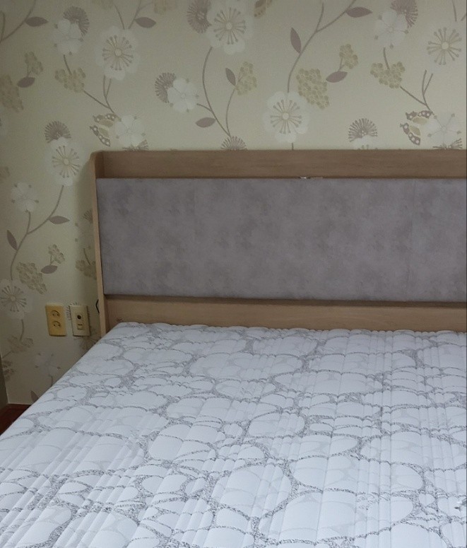우드컬러와 가죽질감의 헤드보드가 조화로운 침대