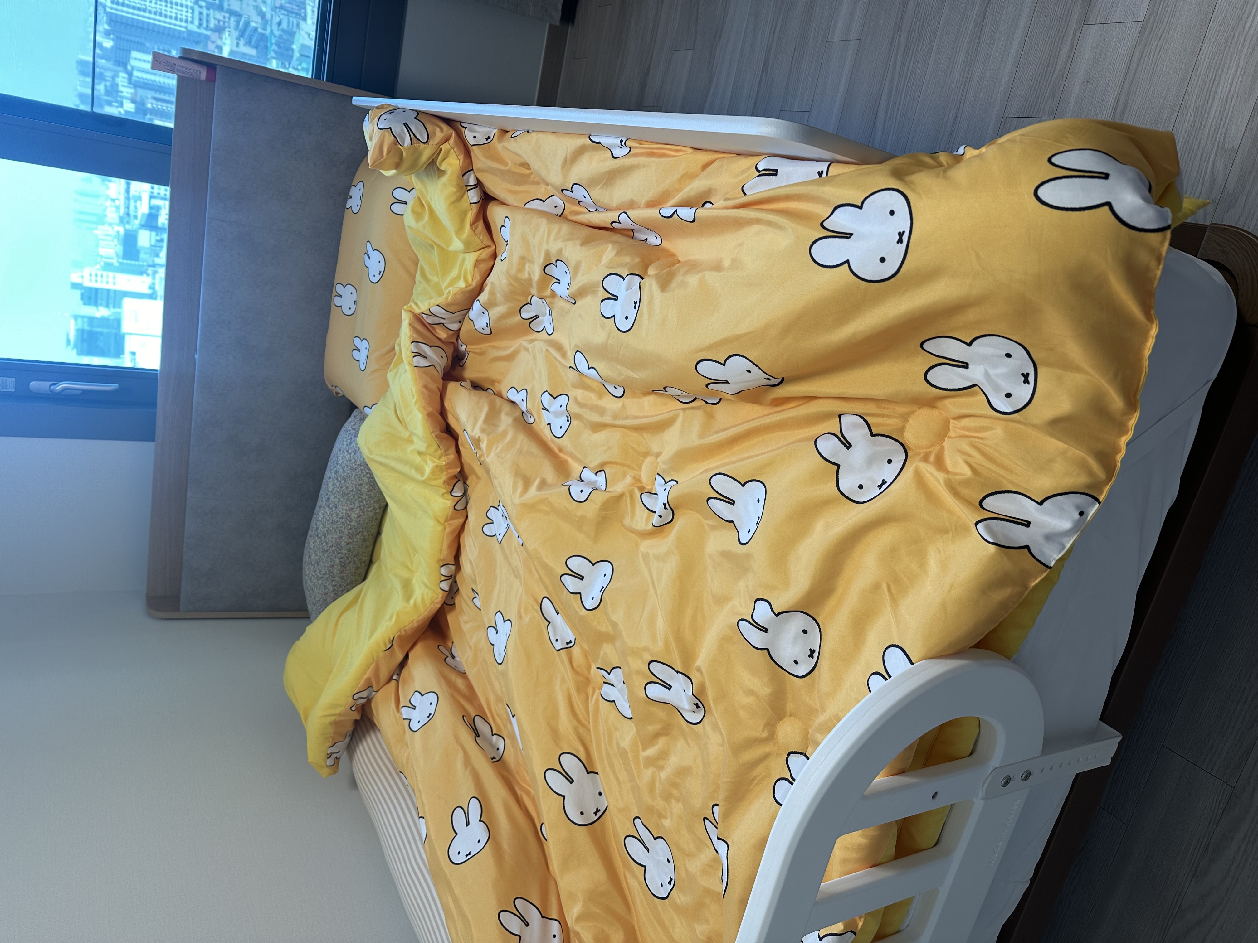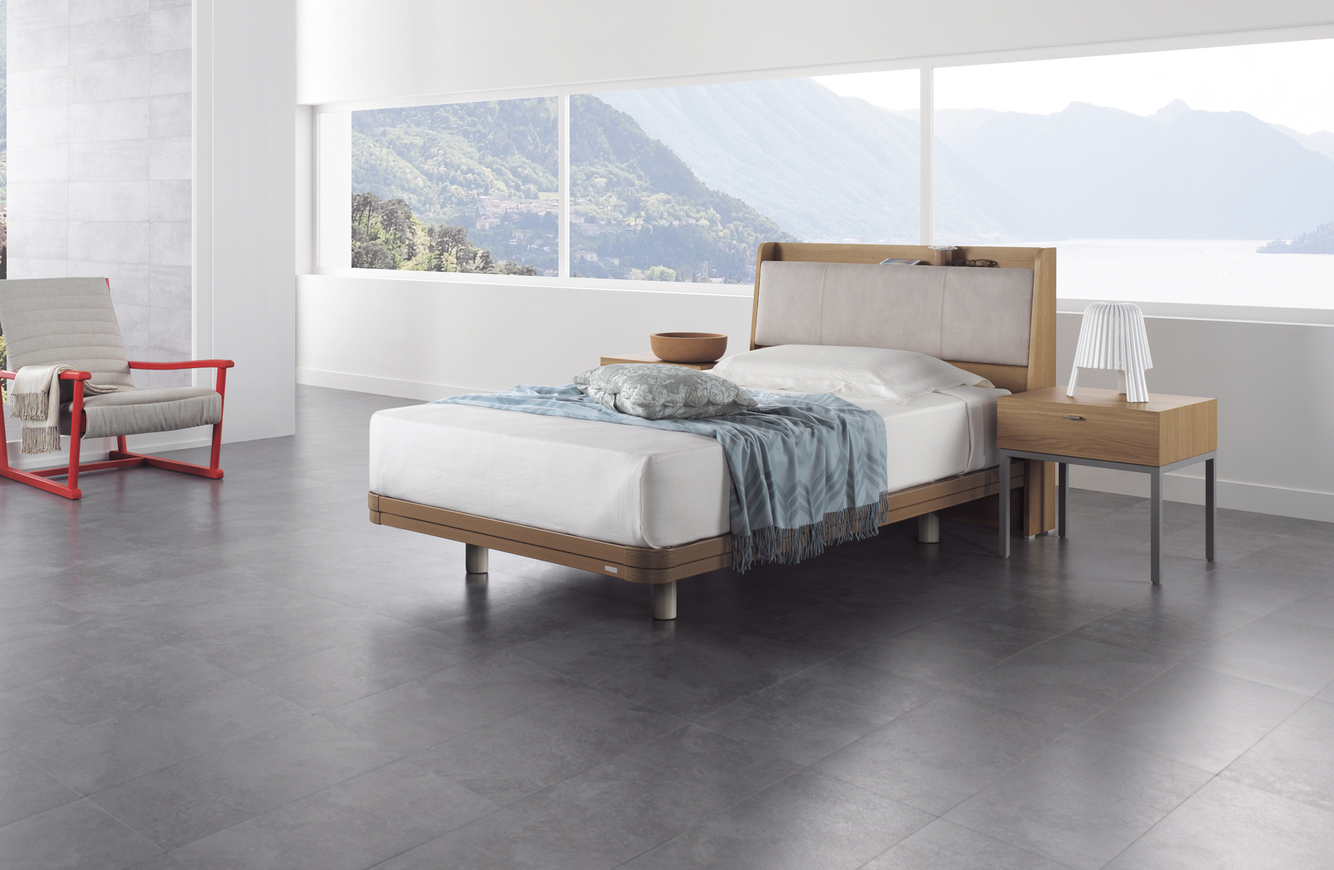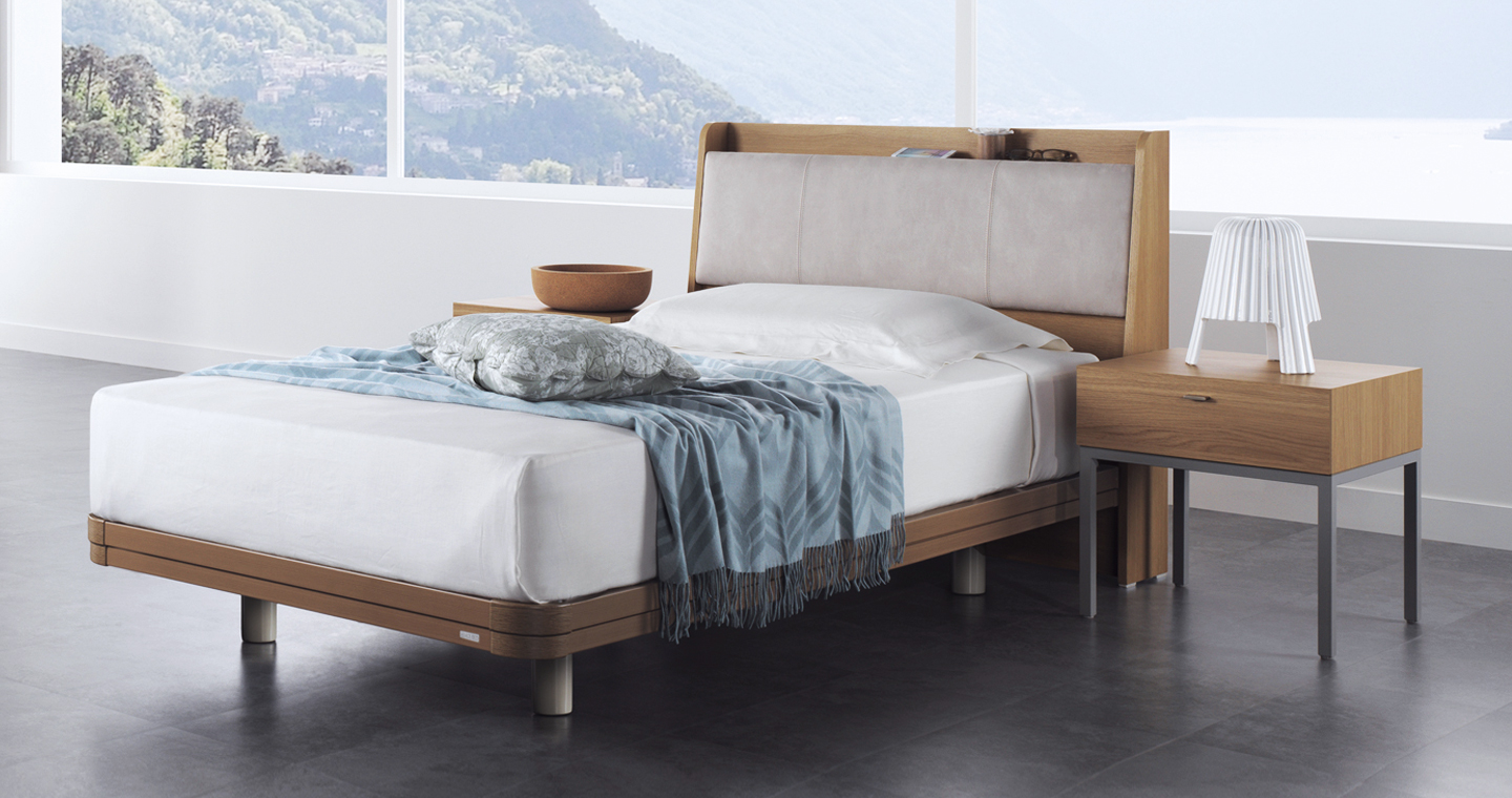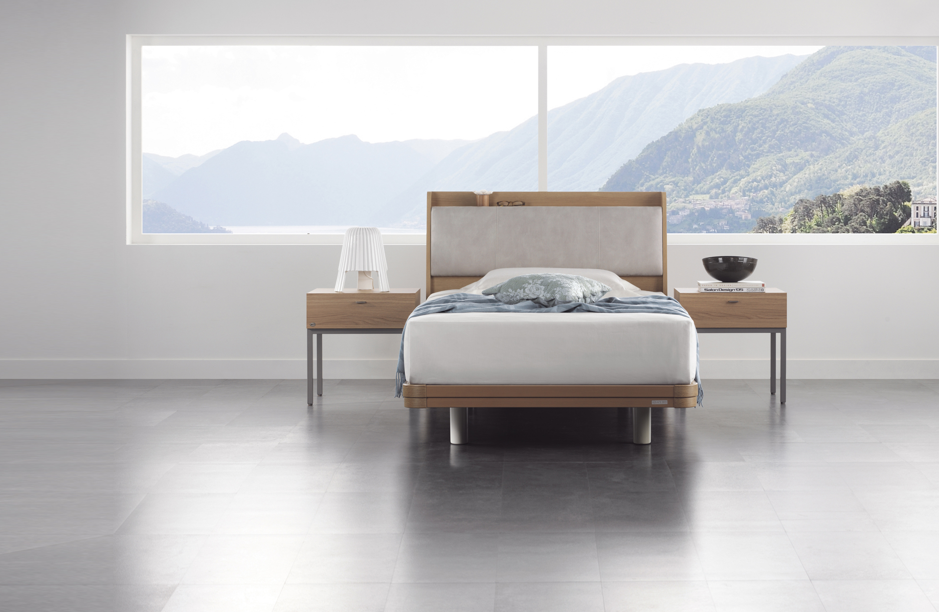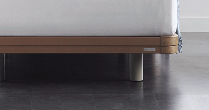 우드컬러와 가죽질감의 헤드보드가 조화로운 침대