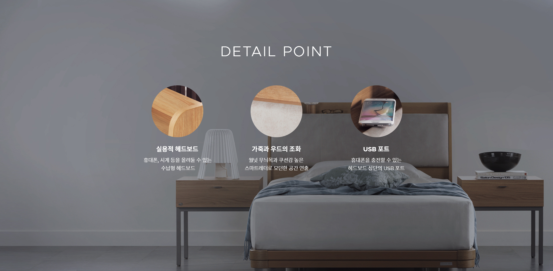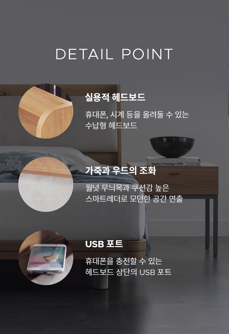 내추럴 오크 컬러 우드에 실용성을 더한 수납기능과 라이트그레이 스마트레더 쿠션의 적용으로 안락한 느낌을 동시에 연출 할 수 있습니다.