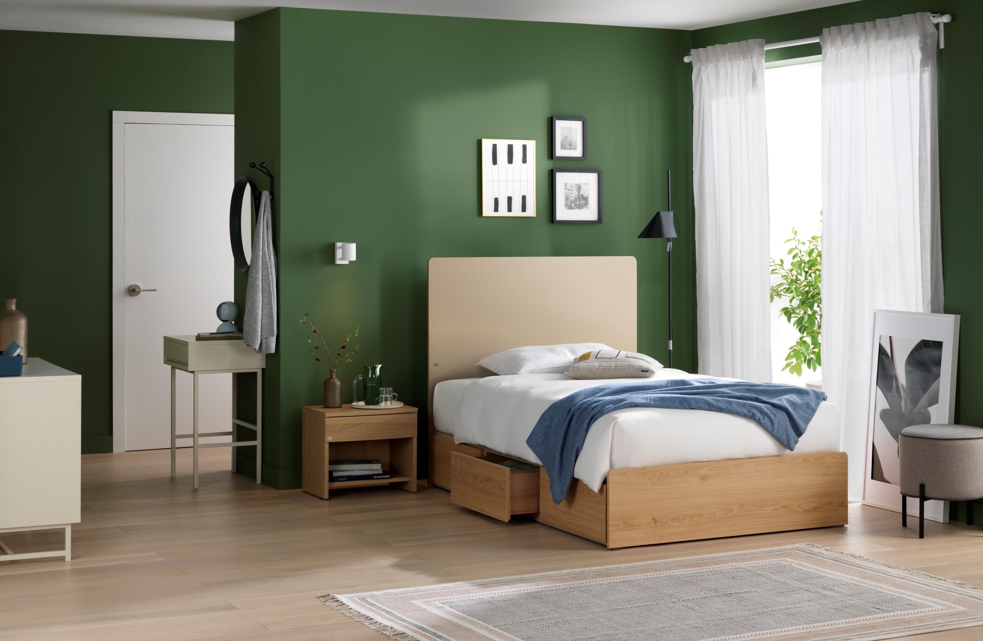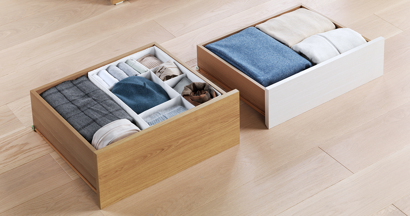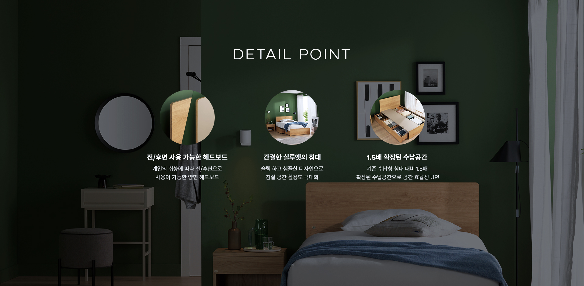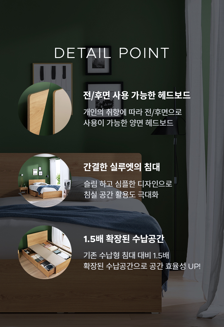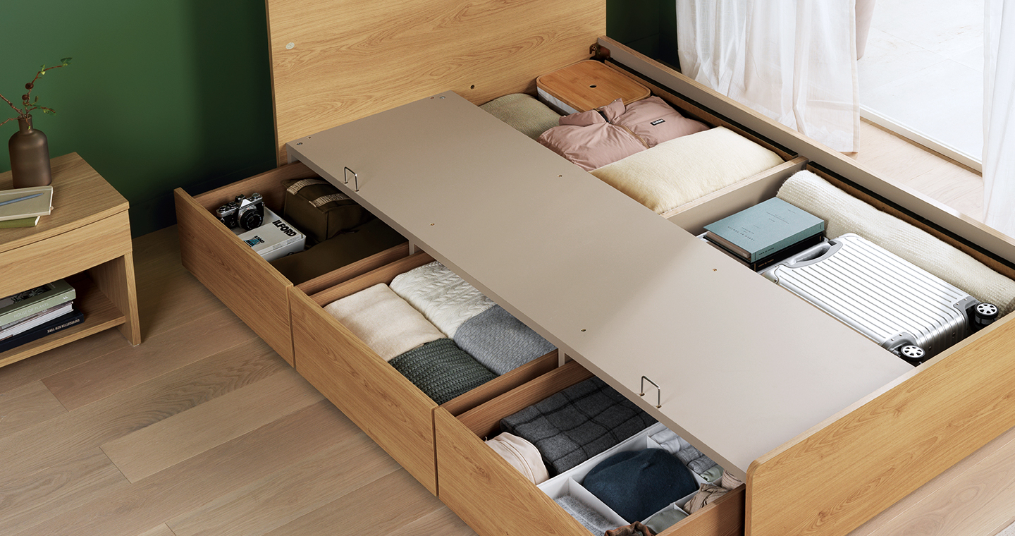 또한 기존 수납형 침대와 비교하여 1.5배 더 넉넉해진 수납공간과 슬림한 헤드보드는 침실 공간의 활용도를 극대화했습니다.