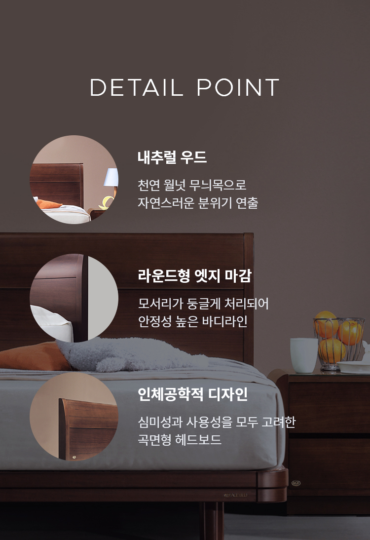 천연 월넛 무늬목 마감을 통해 정서적 안정감과 내츄럴한 분위기를 연출 할 수 있도록 하였습니다.