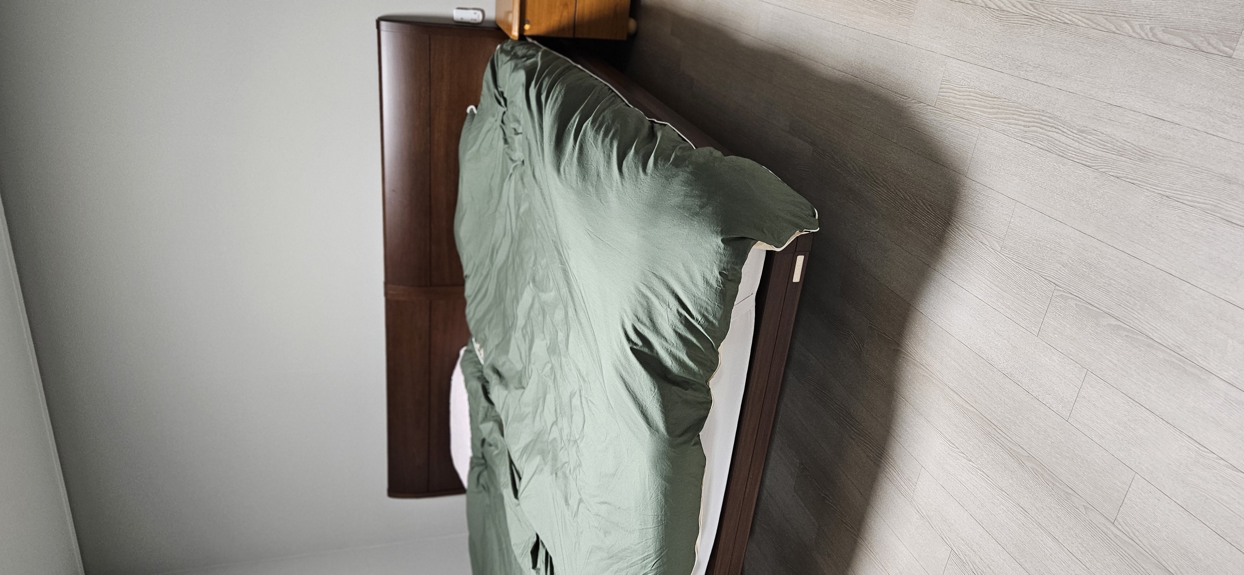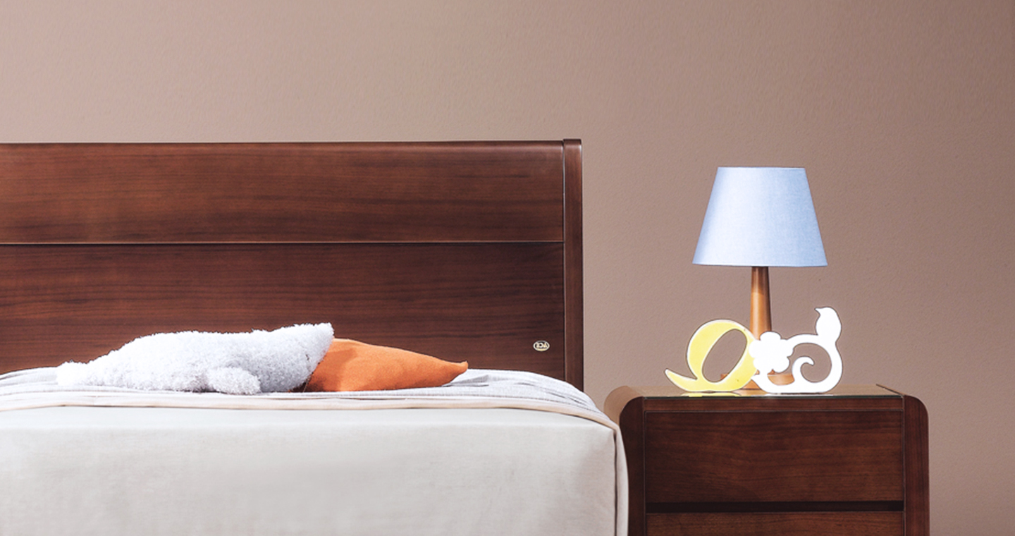 모던한 느낌의 심플하면서도 무난한 디자인의 월넛 컬러의 침대