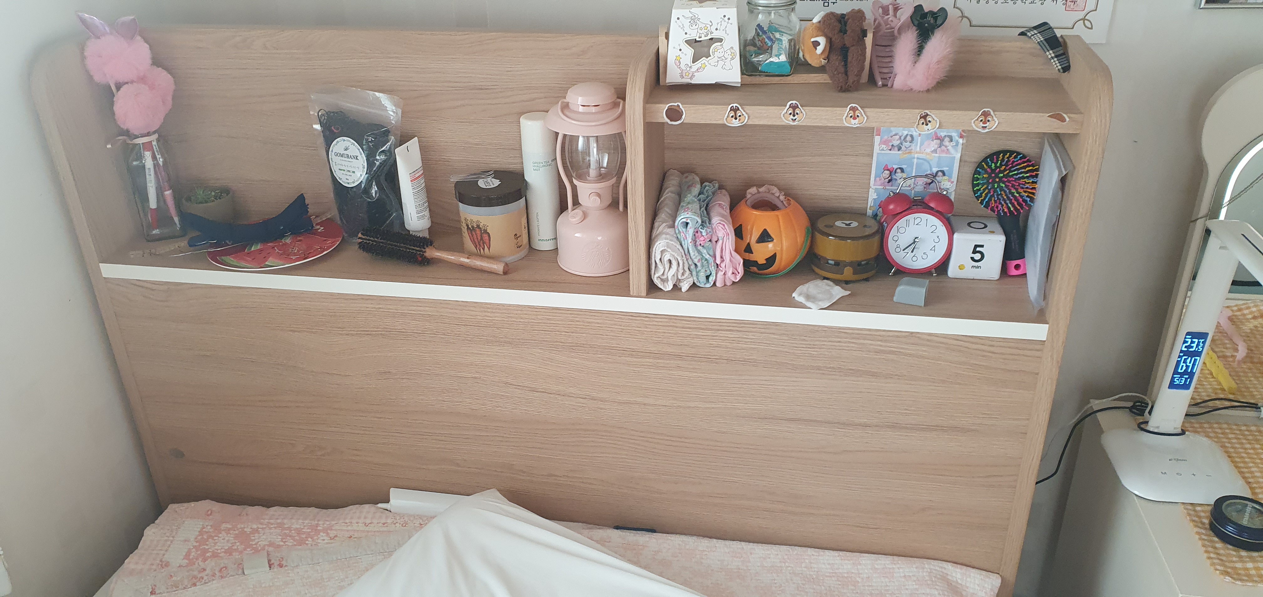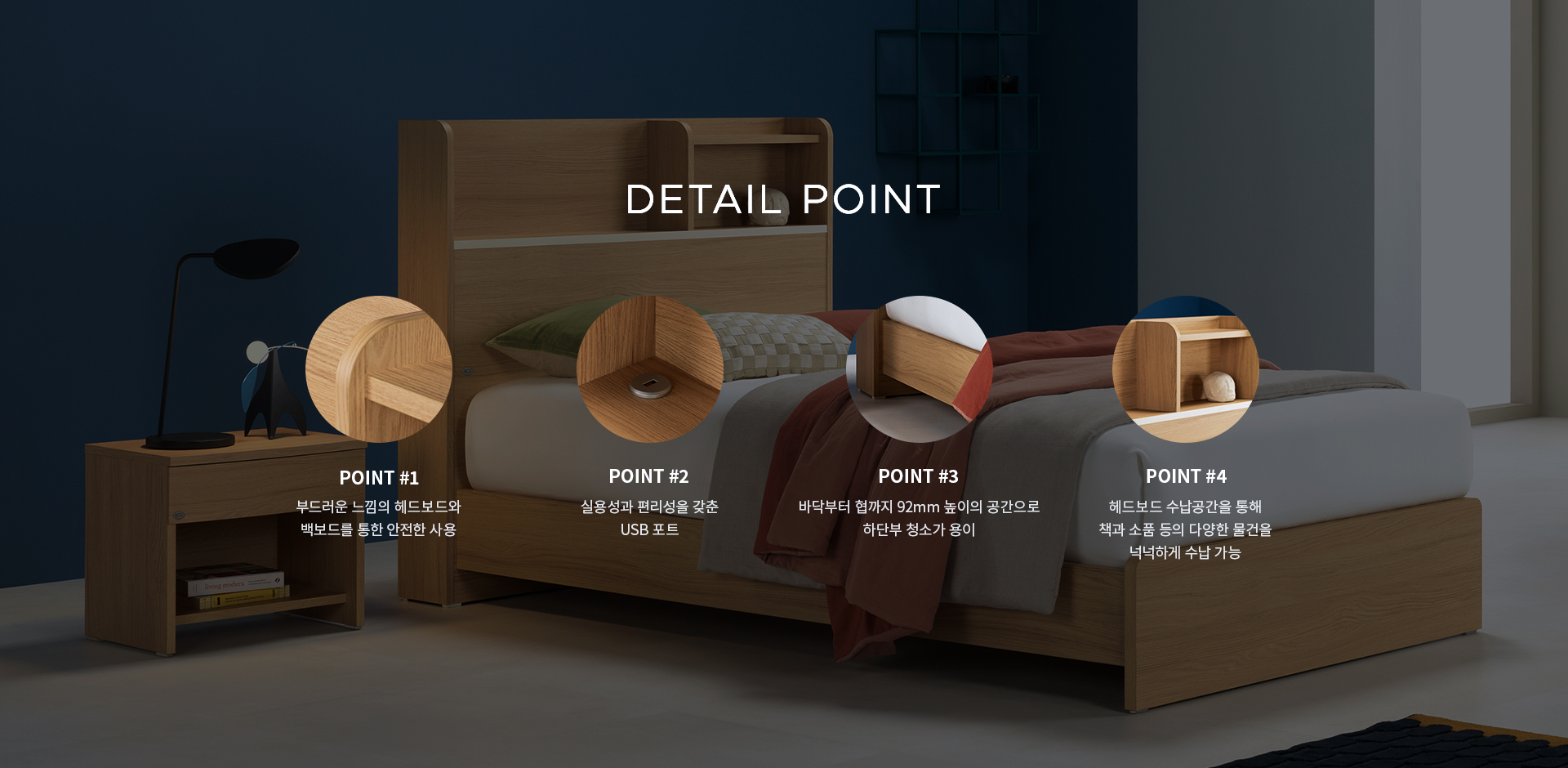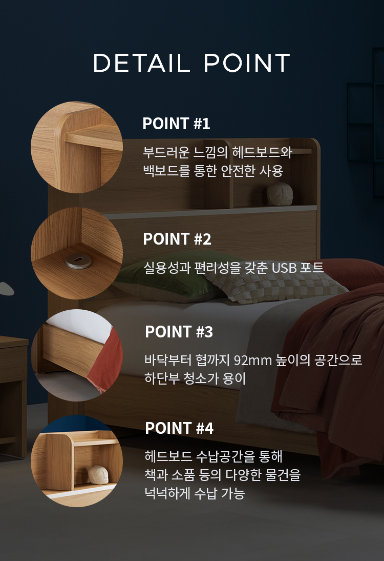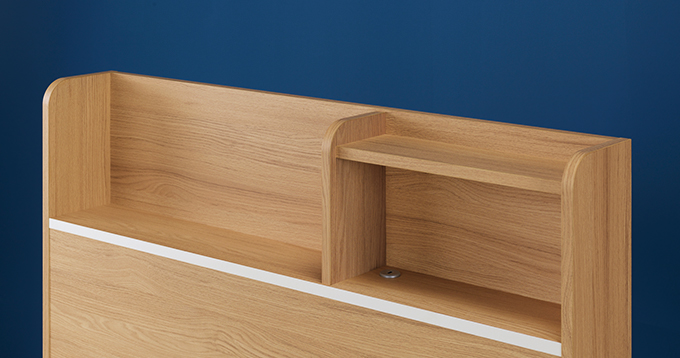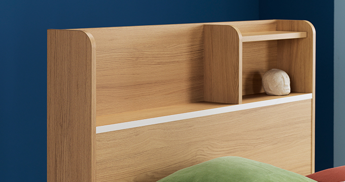 이러한 헤드보드의 넉넉한 수납공간은 다양한 크기의 책과 소품 등의 수납이 가능하며,