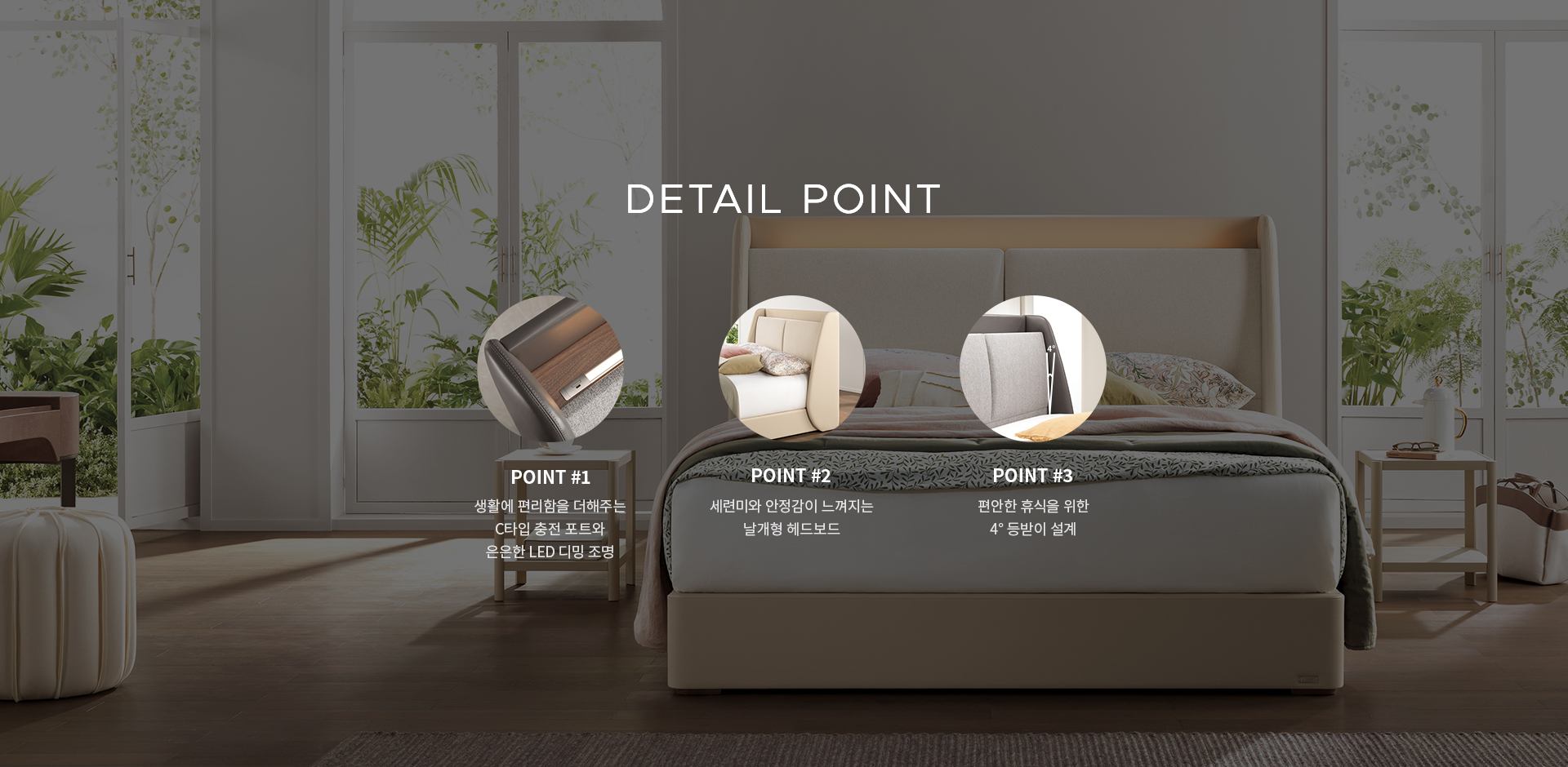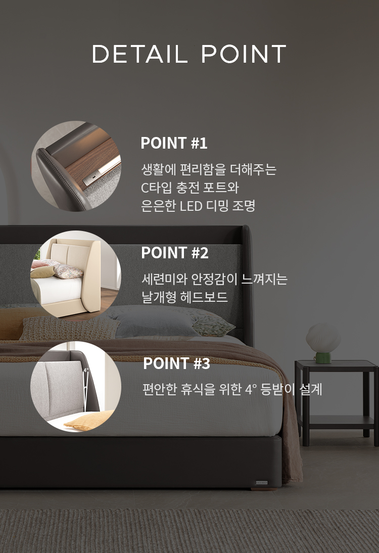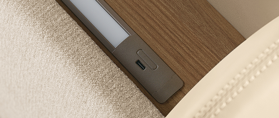 헤드보드 상면에 C타입 USB 충전포트가 탑재되어 있으며 실용적인 무드램프가 적용되어 있습니다.