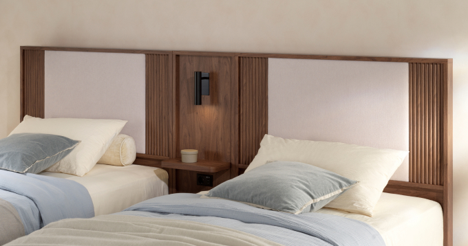 사이드 판넬에는 3단 조명과 하이브리드 콘센트가 섬세하게 내장되어 있어, 밤의 무드를 조절하고 생활의 편의를 더합니다.