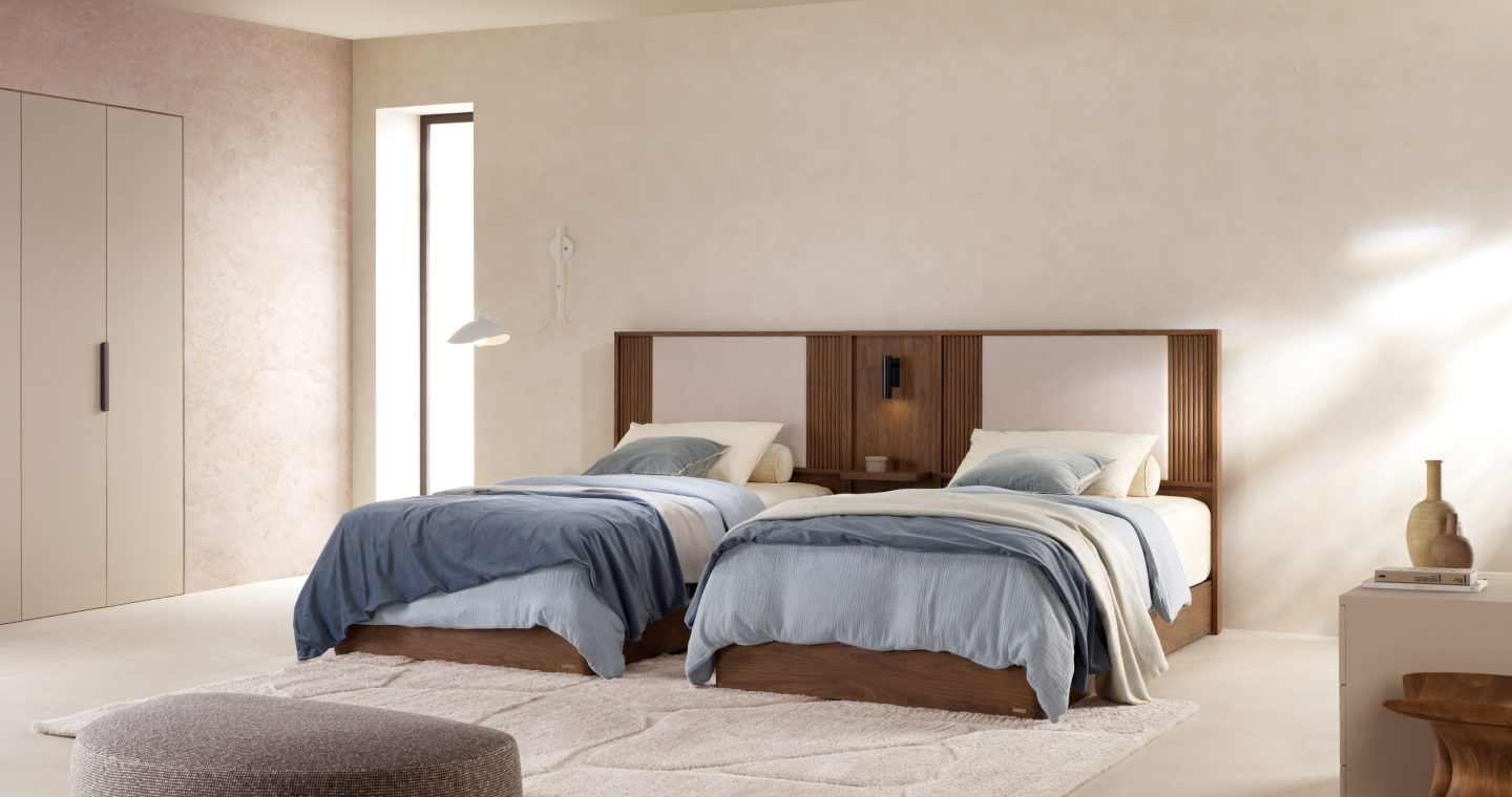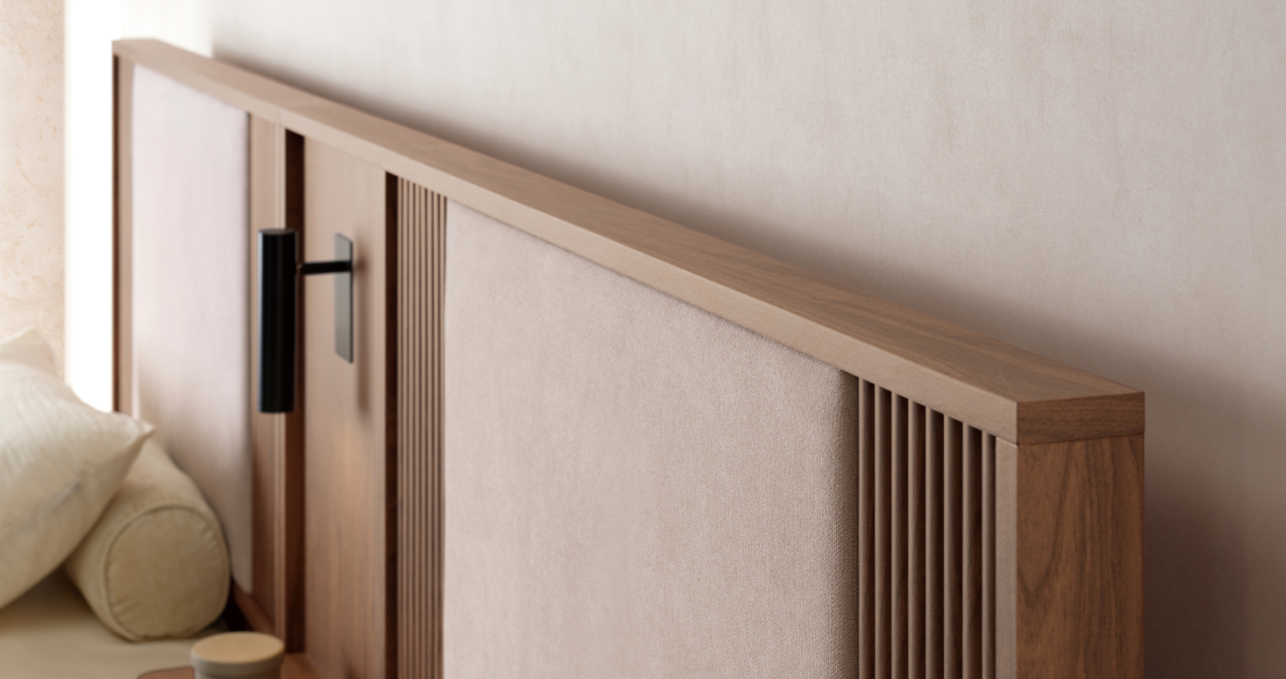 NOVELLA는 입체적인 템바보드와 부드러운 패브릭 쿠션의 조화로 완성된 모던 디자인의 침실입니다.