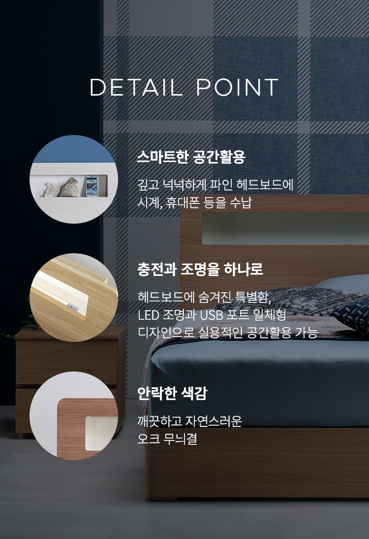 헤드보드에 USB포트가 내장되어 편리하게 사용할 수 있습니다.