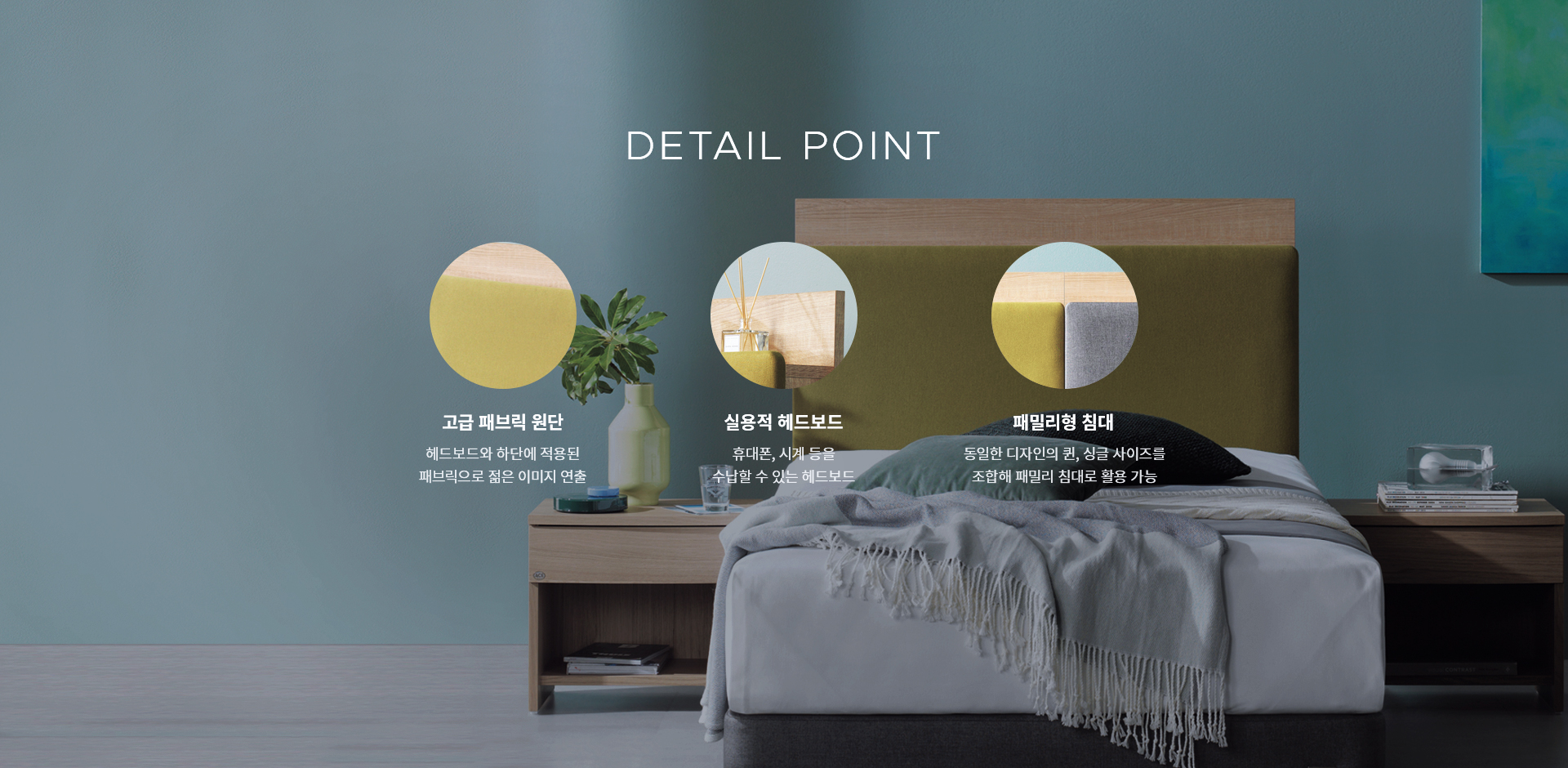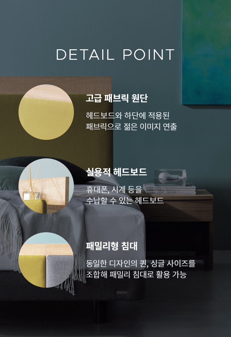 고급 수입원단을 헤드보드와 N타입 매트리스 옆면에 적용하였으며 산뜻하고 포근한 촉감을 자아냅니다.