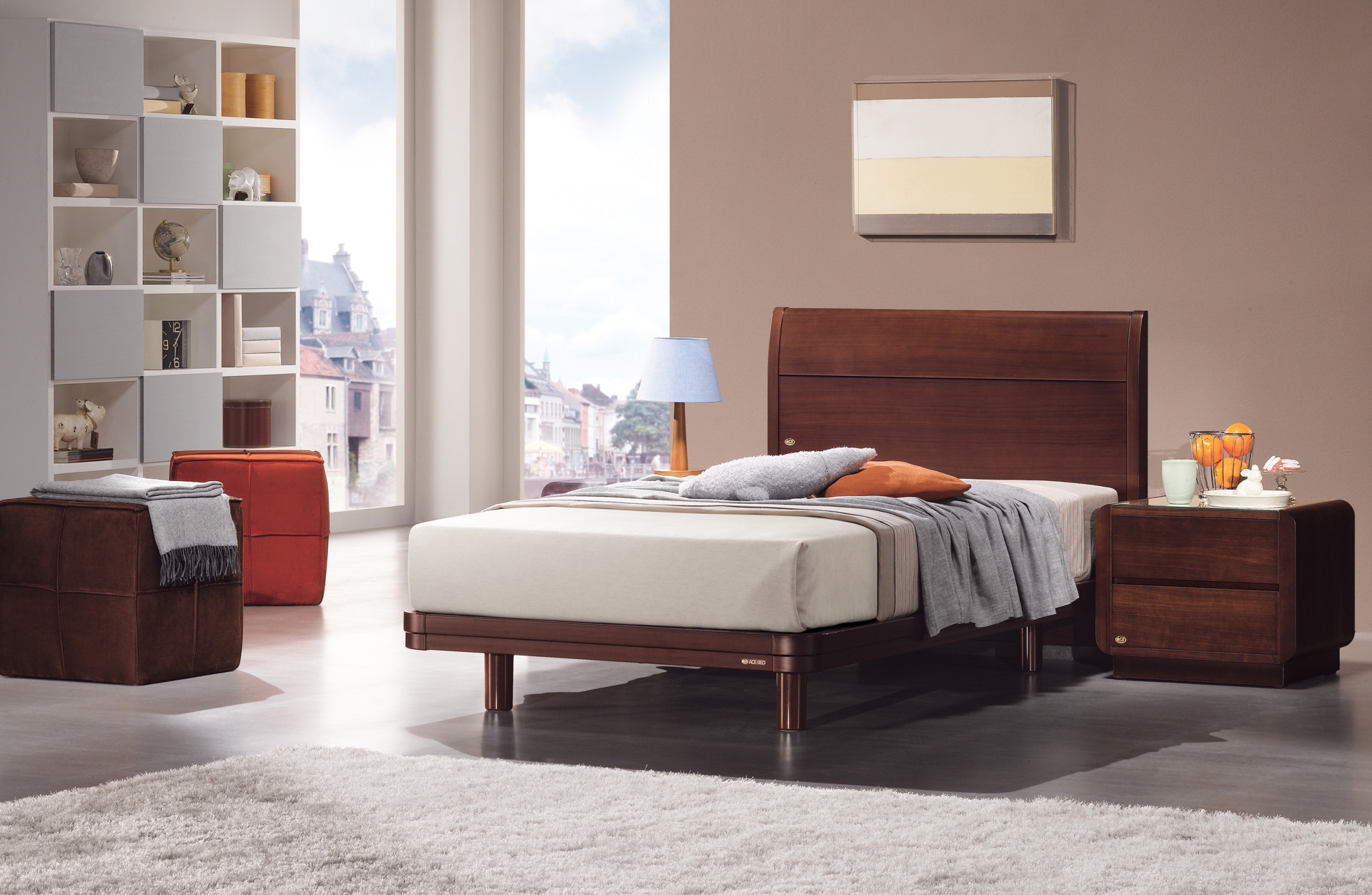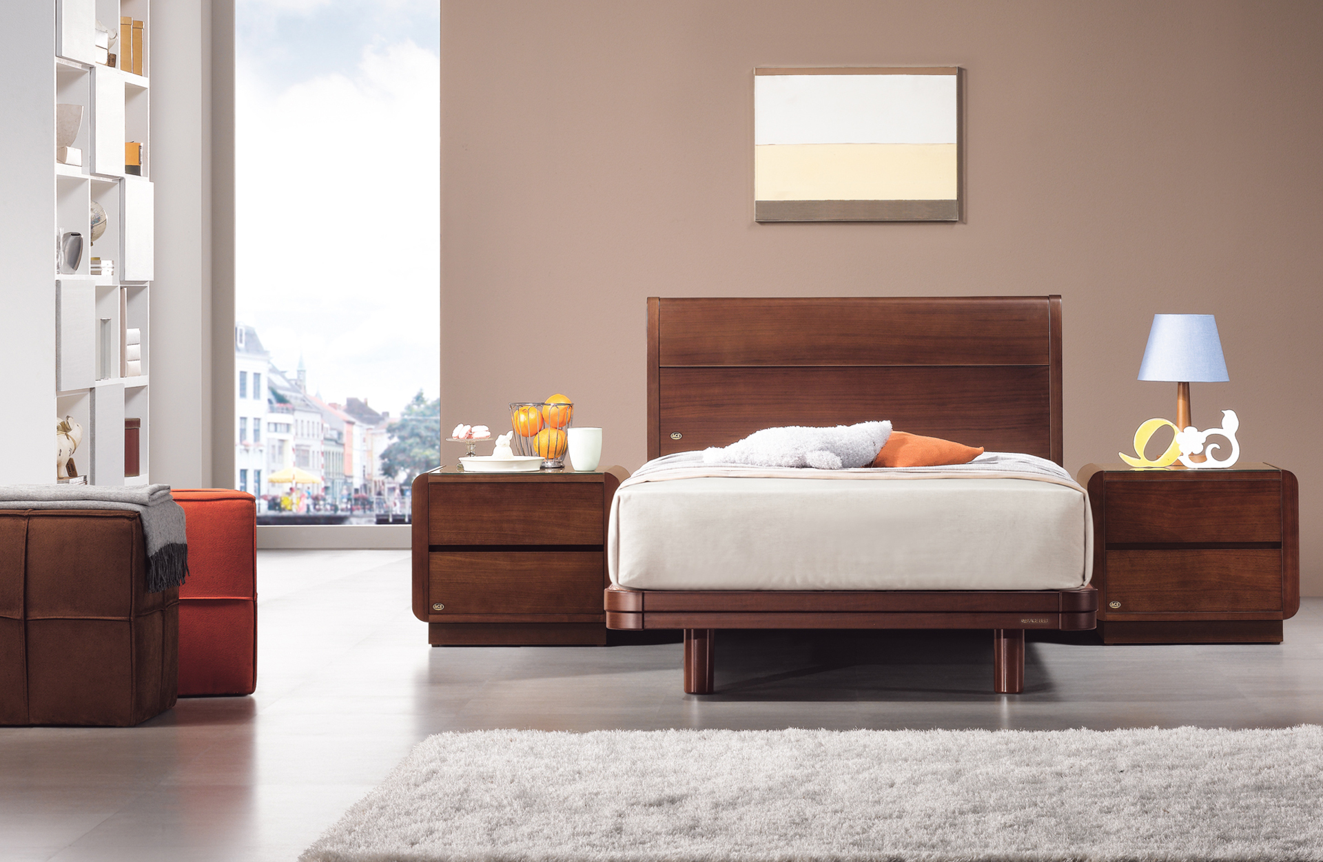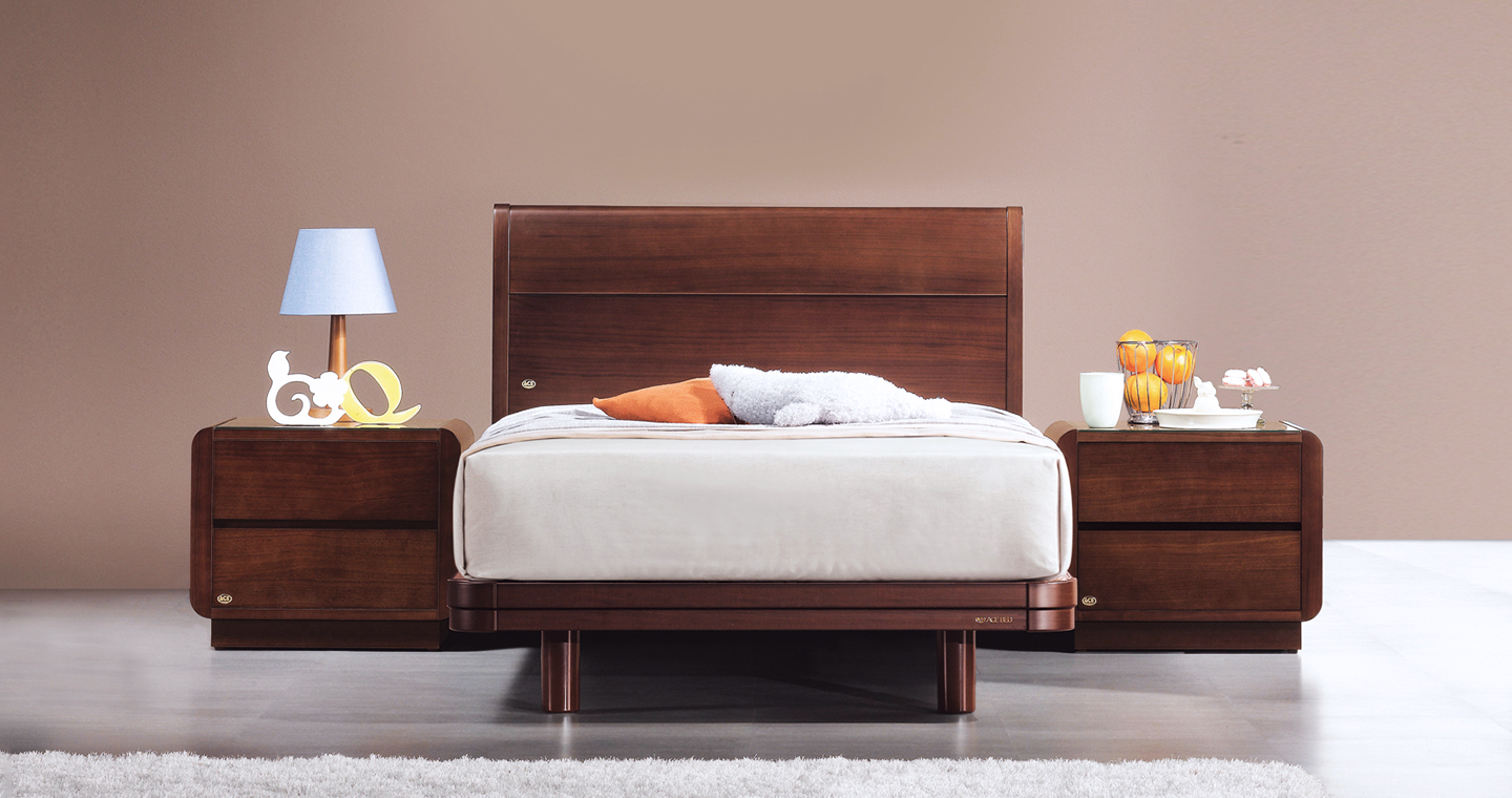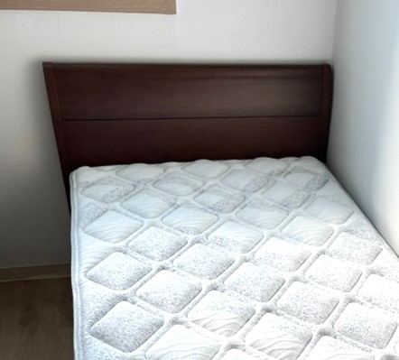 모던한 느낌의 심플하면서도 무난한 디자인의 월넛 컬러의 침대