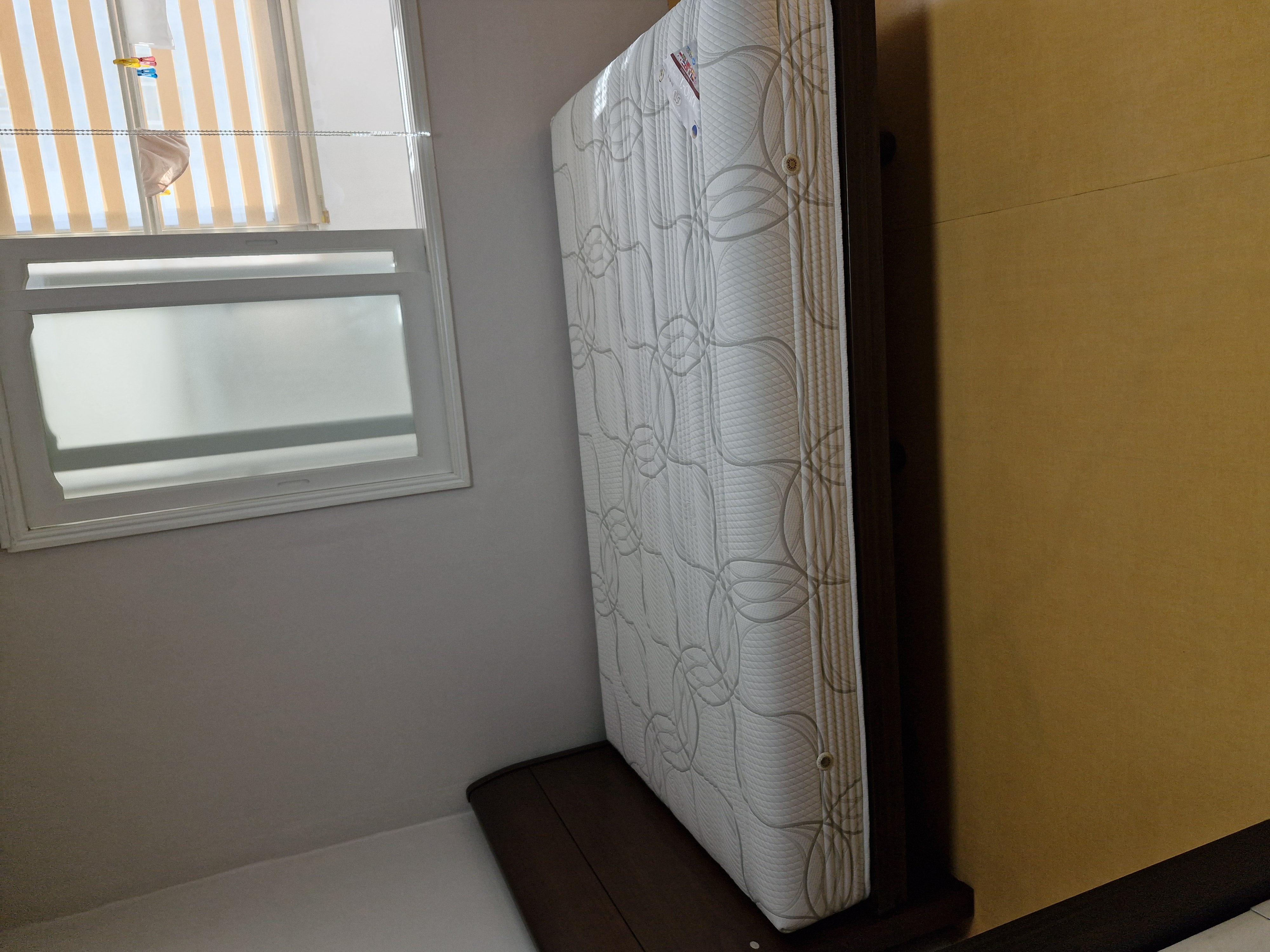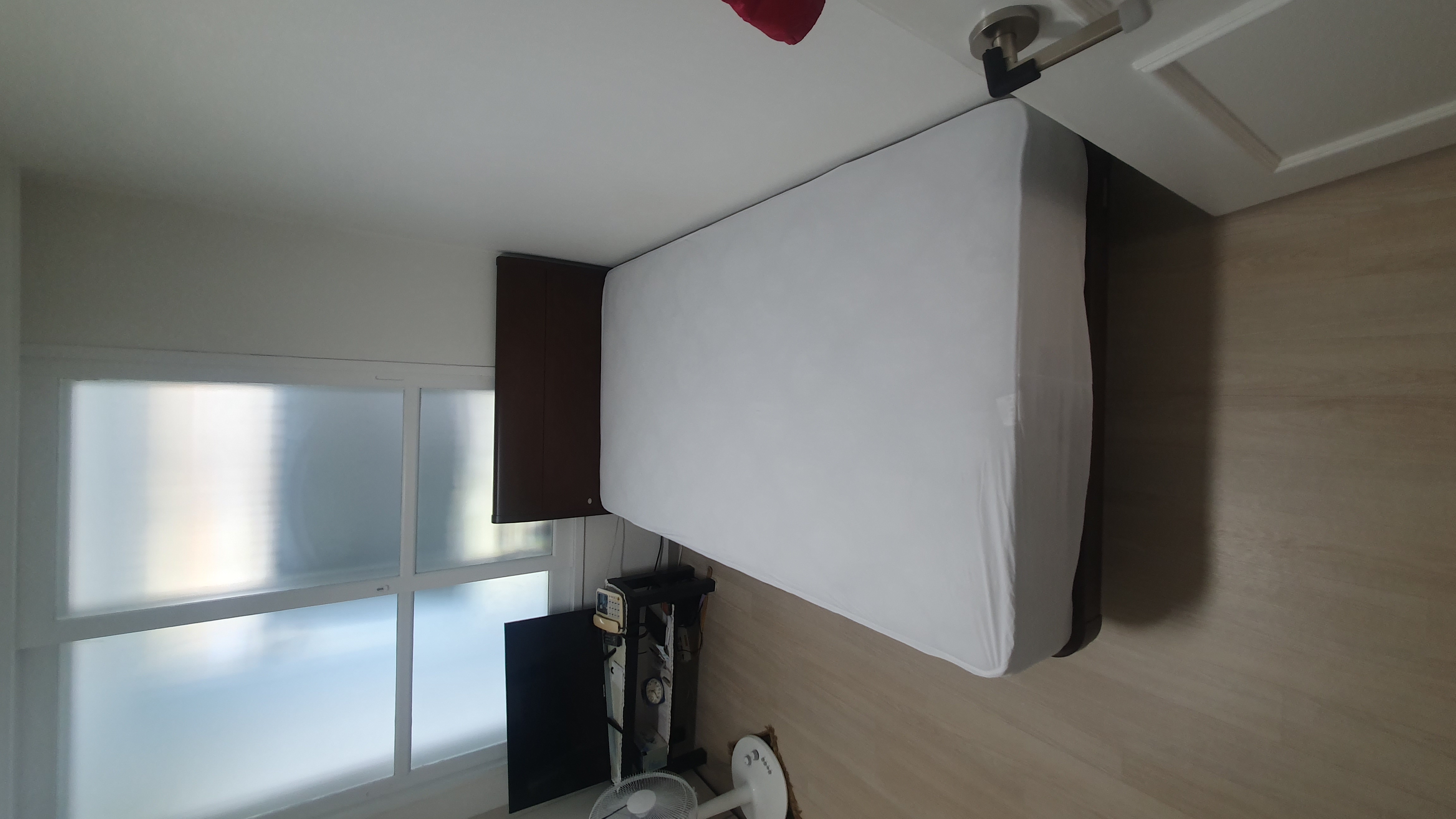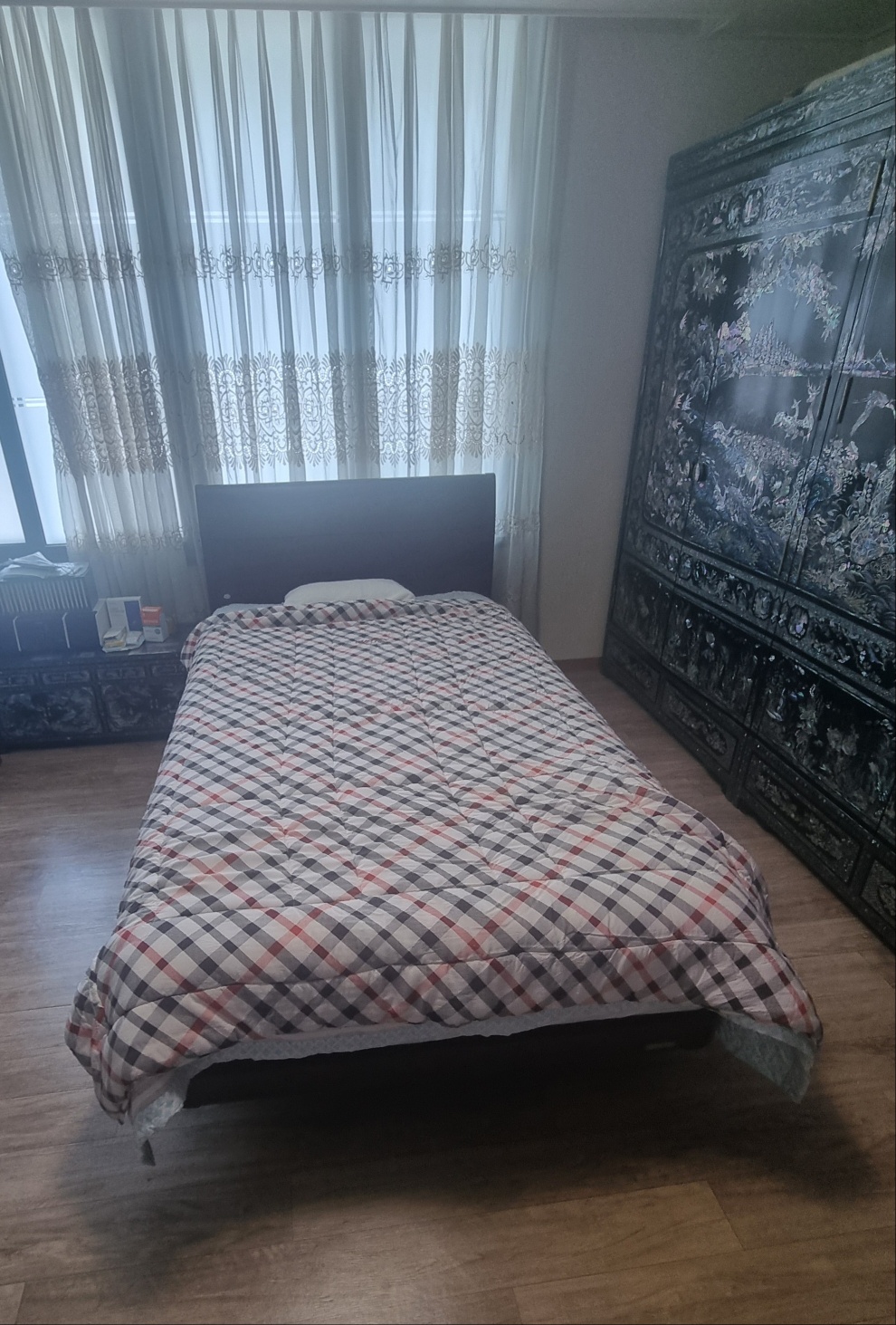 모던한 느낌의 심플하면서도 무난한 디자인의 월넛 컬러의 침대