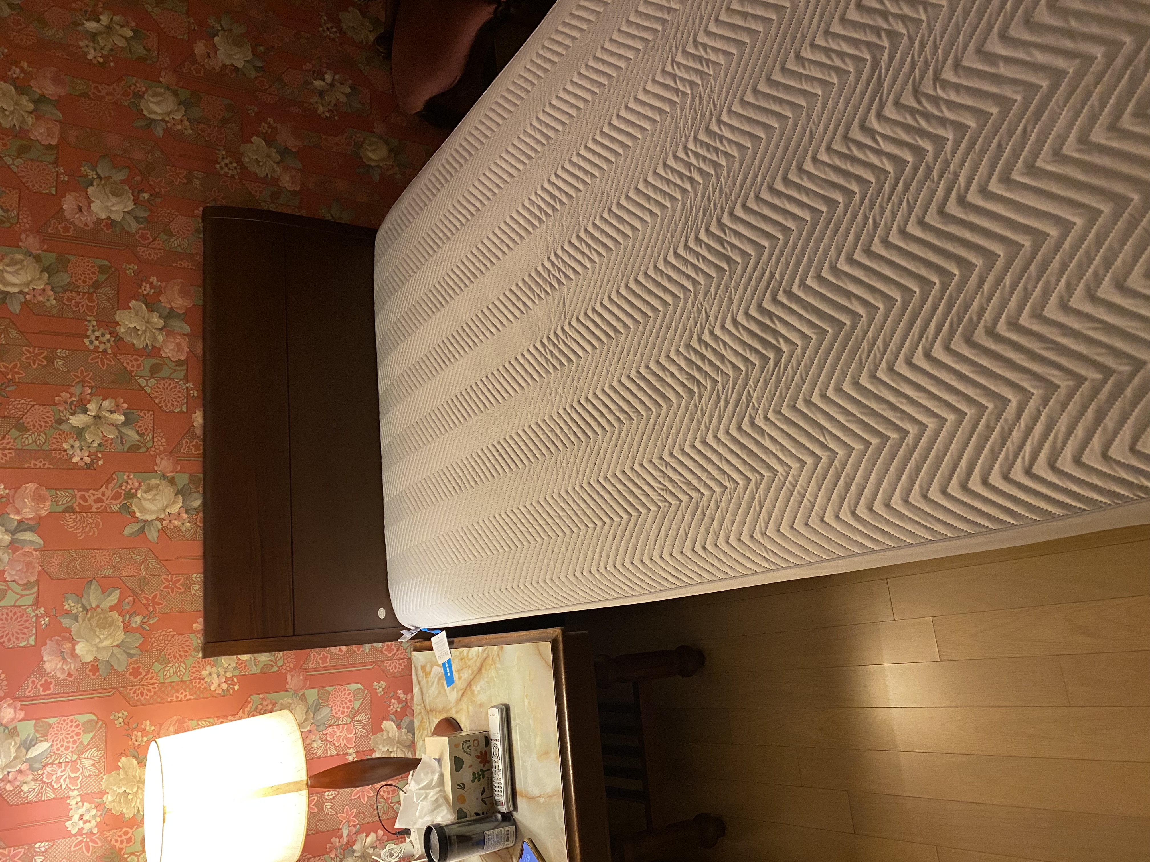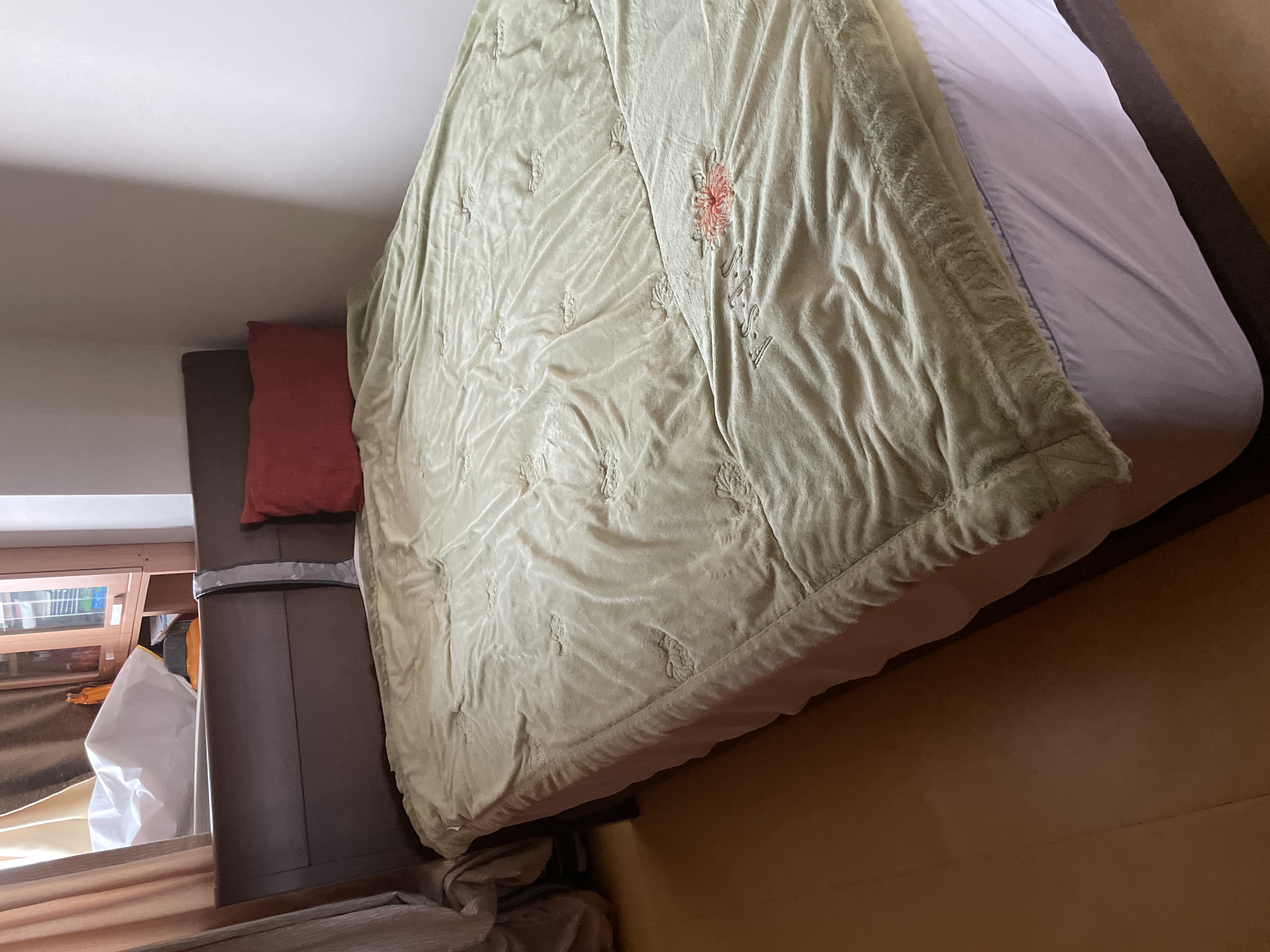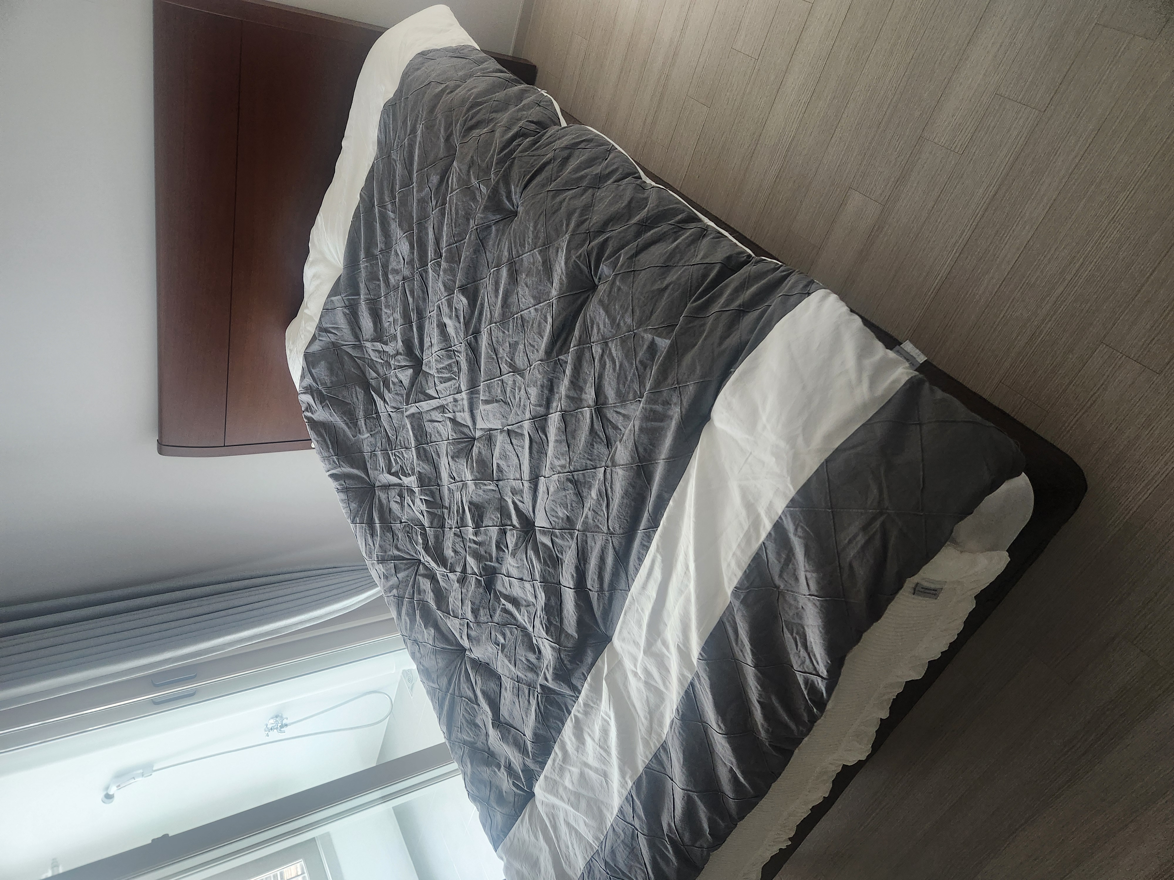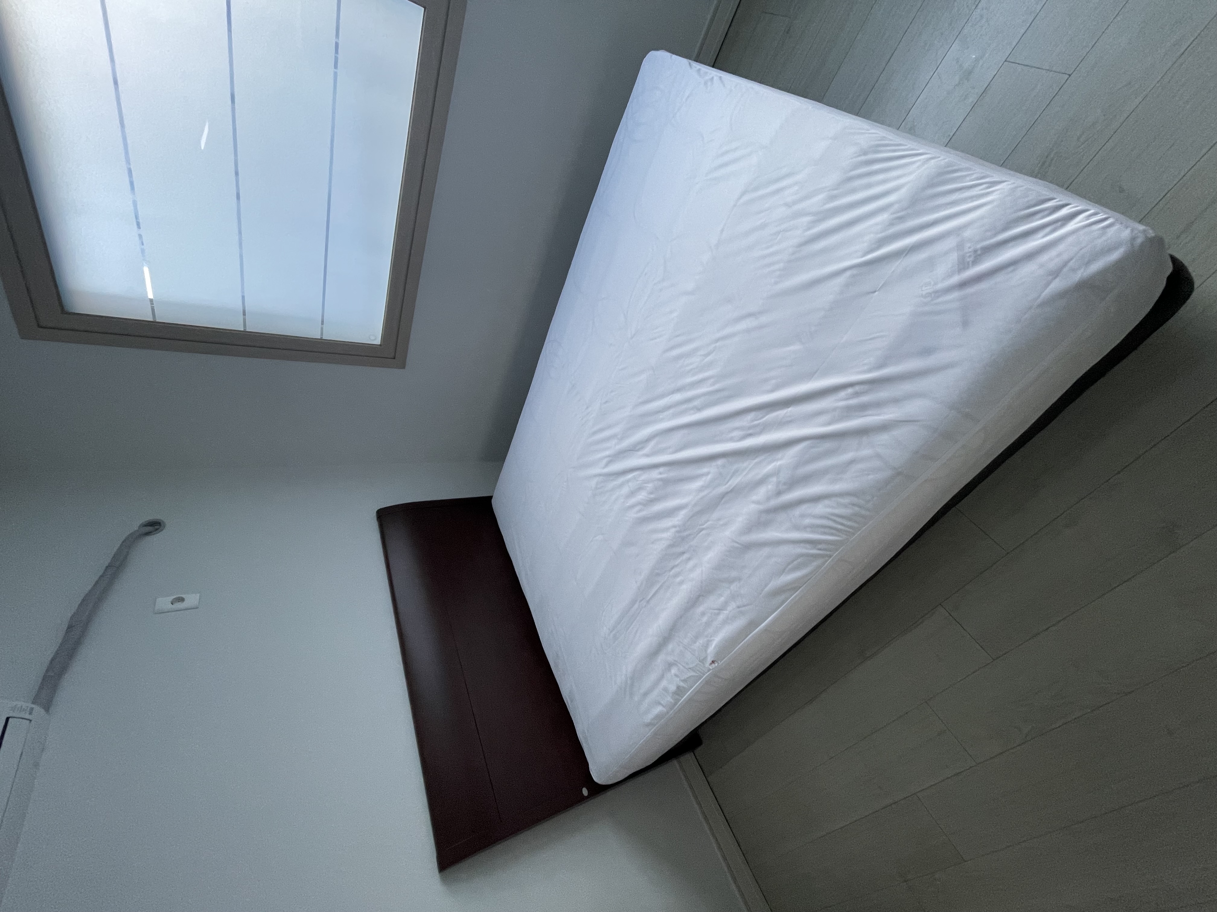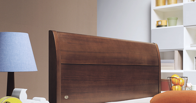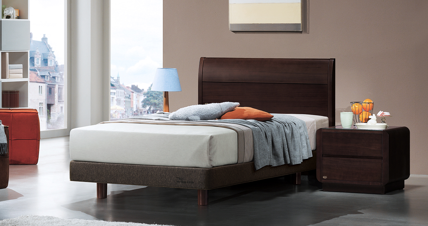 모던한 느낌의 심플하면서도 무난한 디자인의 월넛 컬러의 침대