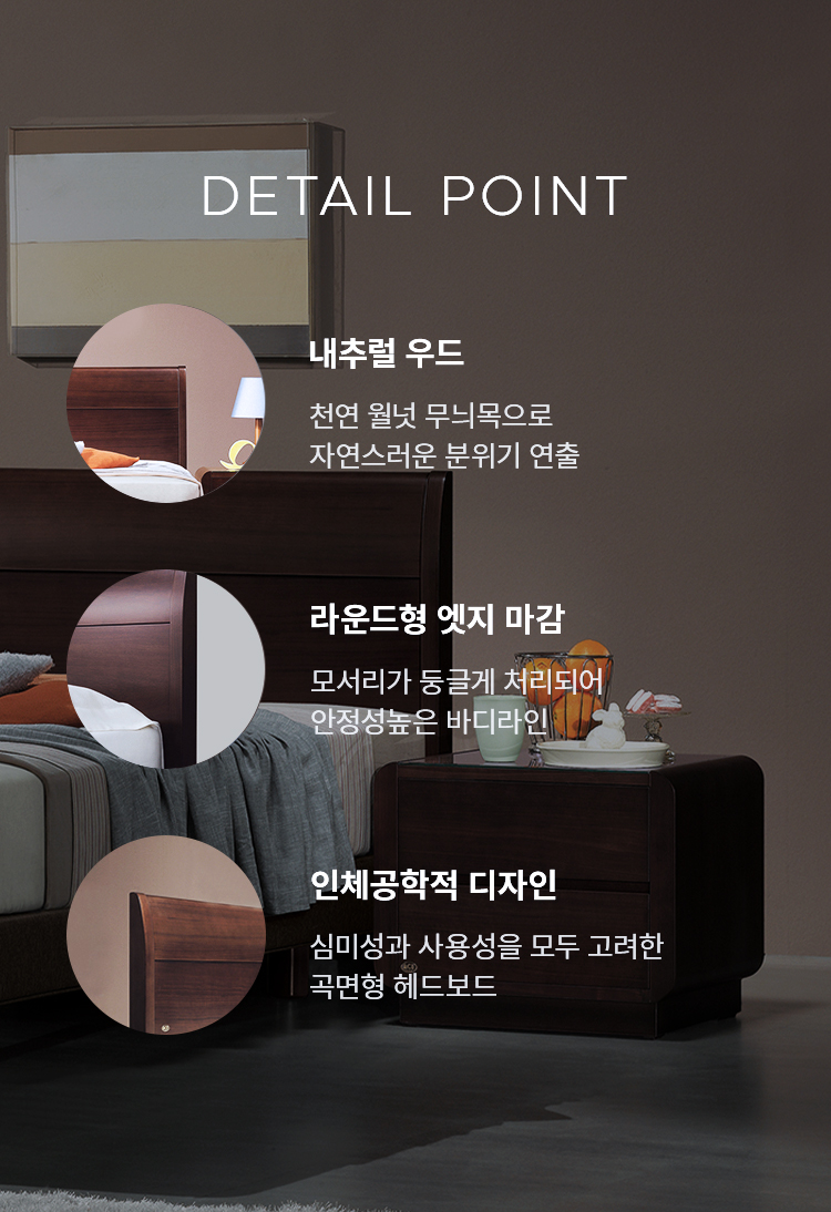 천연 월넛 무늬목 마감을 통해 정서적 안정감과 내츄럴한 분위기를 연출 할 수 있도록 하였습니다.