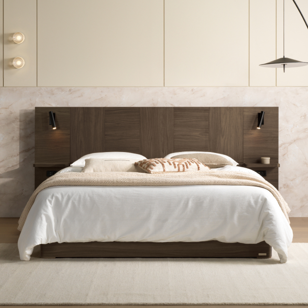 균형 잡힌 조형미와 뱅가드 월넛 특유의 차분하고 세련된 톤으로 내추럴하면서도 고급스러운 분위기를 연출하는 호텔 스타일의 침대입니다.