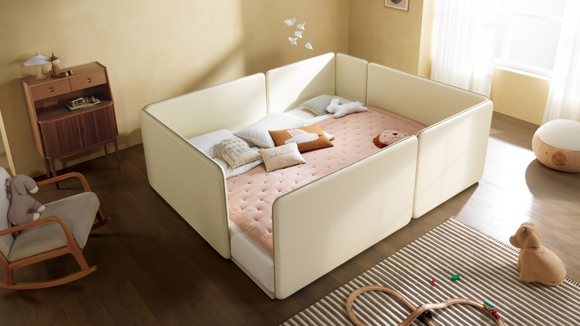 날개형 파티션으로 취향에 맞게 다양한 커스텀이 가능한 모듈형 침대입니다.